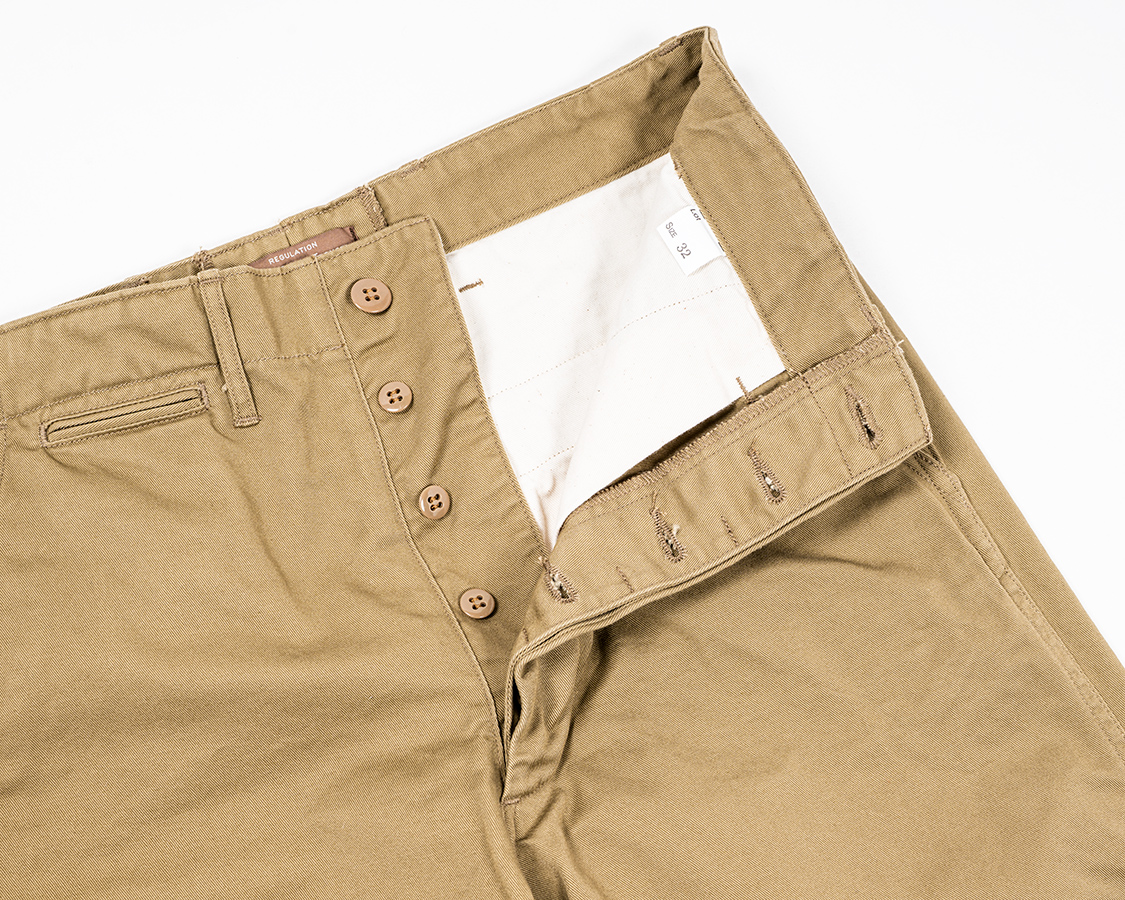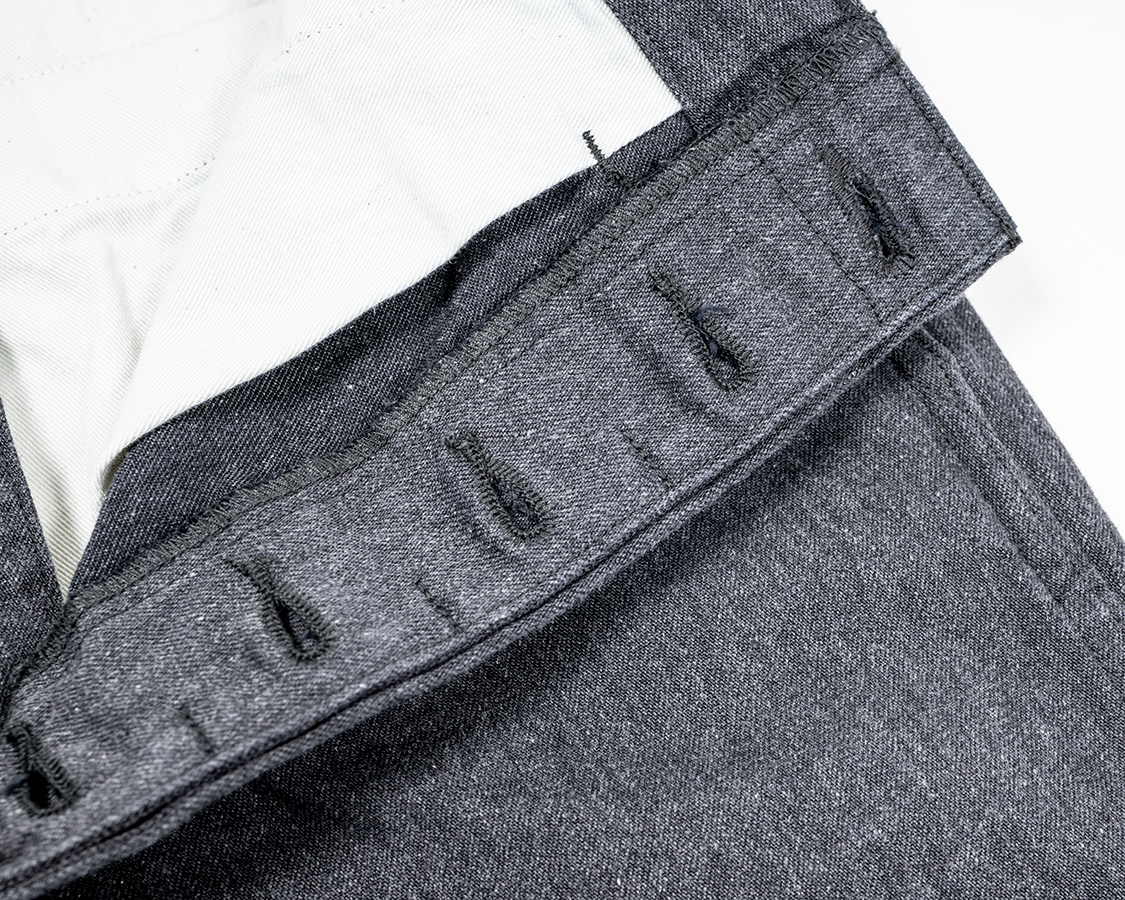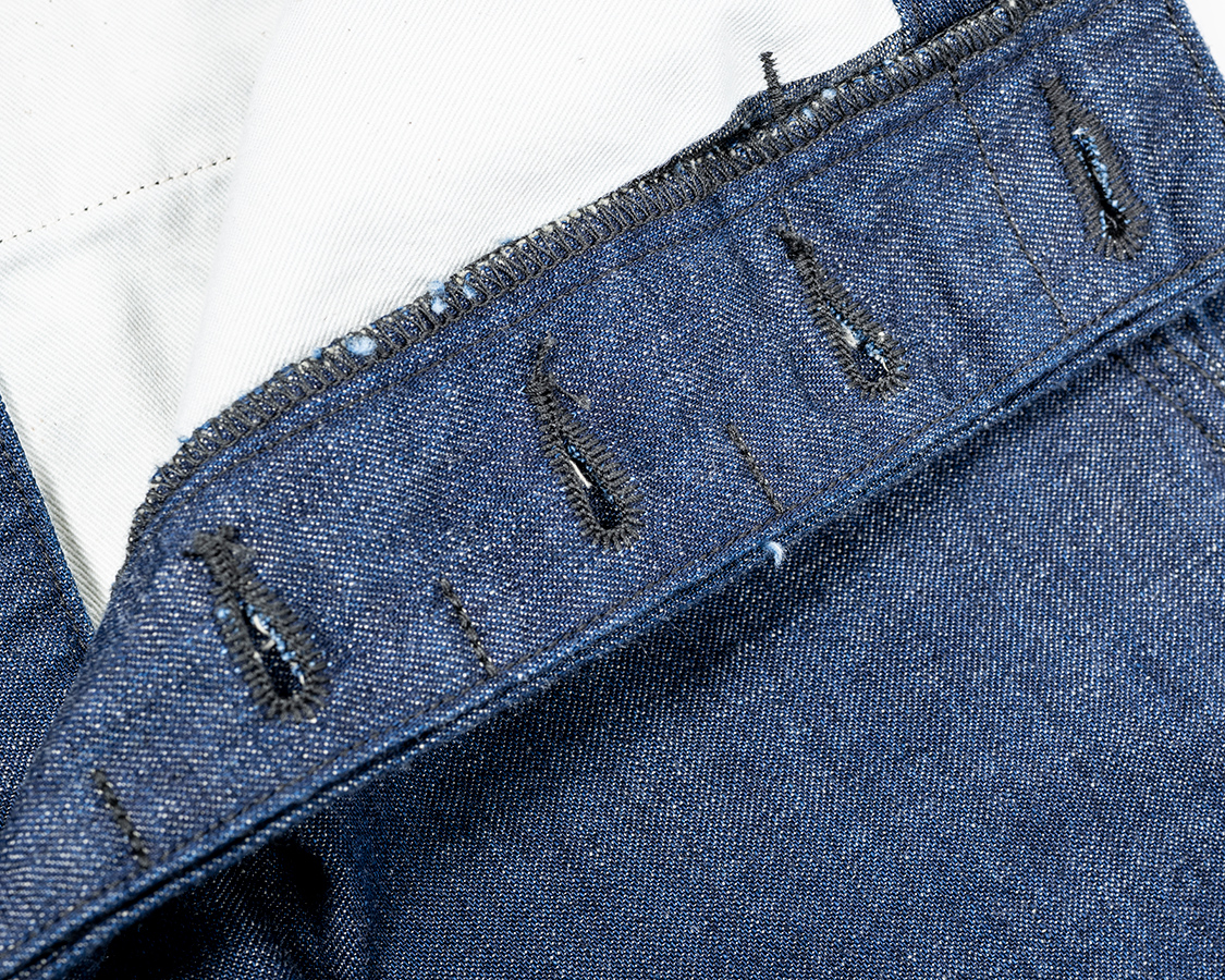 フロントボタンフライ。WORKERS伝統の「いい加減ファスナーにしたら?」と言われる部分ですがこだわりです。ファスナーと違って、ボタンが取れても直しやすいというのもあります。