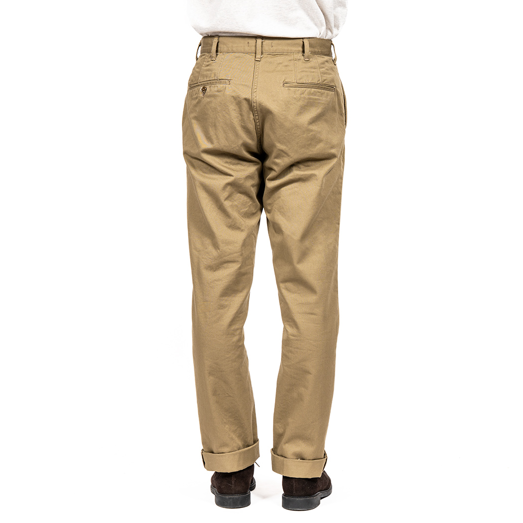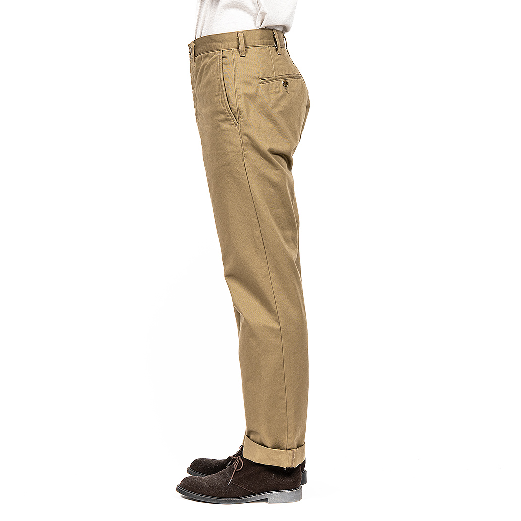 「別帯」、帯を身頃とは別パーツ。コイ ンポケットにはフラップ。ヒップの丸み、後ろダーツを2本に分散して綺麗に出るように。尻繰りはダブルステッチ巻き縫い、脇・ 内またはインターロック。強度優先の縫製でラフに穿けるストレートシルエットのチノパンを目指しました。Slimと見比べてもらうと仕様の違いがよくわかります。