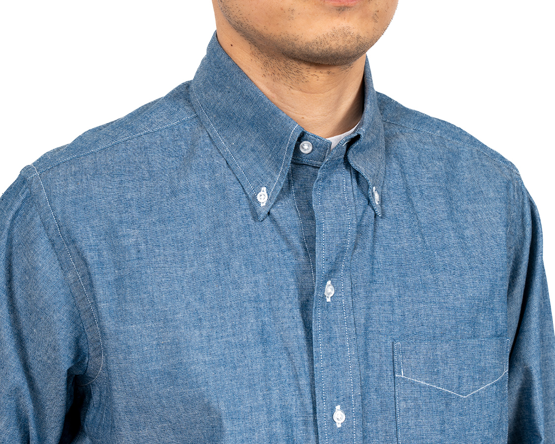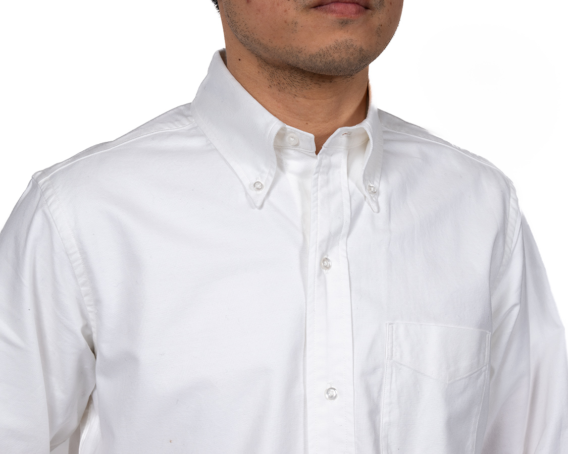 Modified BDと比べてみてください。ここが開いている分、台襟のボタンを開けると中に着たTシャツの首元がよく見えます。本来、台襟のボタンを閉めて着るシャツが、古着になって日本に入ってくる。ネクタイを閉めないで着る。結果、首元が見えて、中に着るTシャツまでコーディネートの対象になる・・・という、進化というか、変化というか。服が、本来作られた目的から外れて、徐々に着方が変化していく、面白いところです。(海外のアイビーリーガーもネクタイなしでTシャツの首元を見せたりはしていそうですが。映画「セントオブウーマン」あたりをみてみてください)