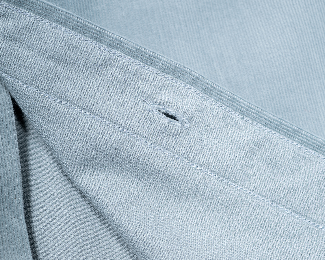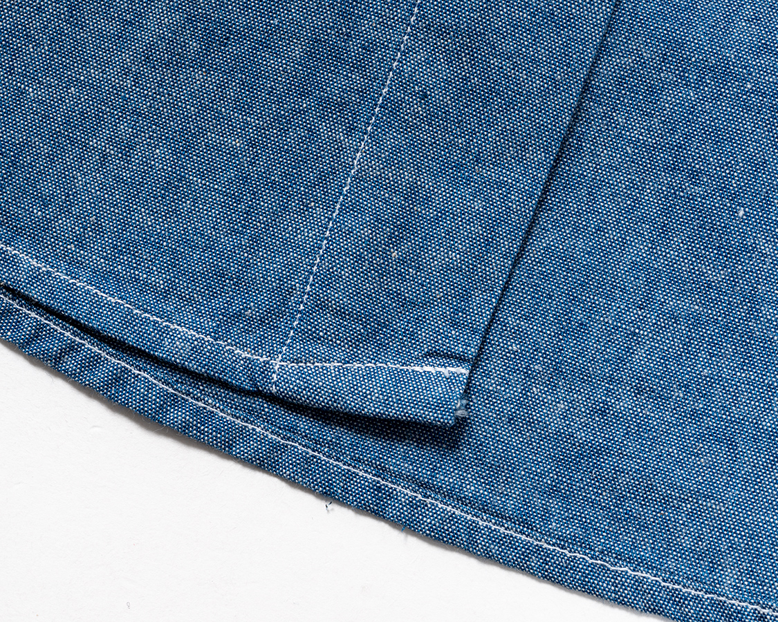 超どうでもよいのに、つい再現したくなる。裾の三巻の端、手勝手でいうと縫いの最後の部分。ここで金具を抜いて「ぐい!」っと太く縫う。これが、古着のシャツでよくやっているので再現してもらいました。