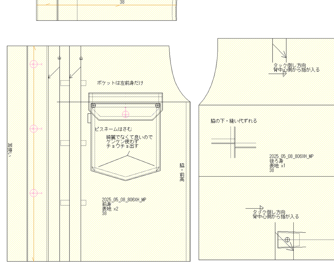 パターンはこんな感じ。図まで描いて指示するのが私のしつこいところです。こう書いておかないと、無理に合わせてくれようとする工場さんもいるので。