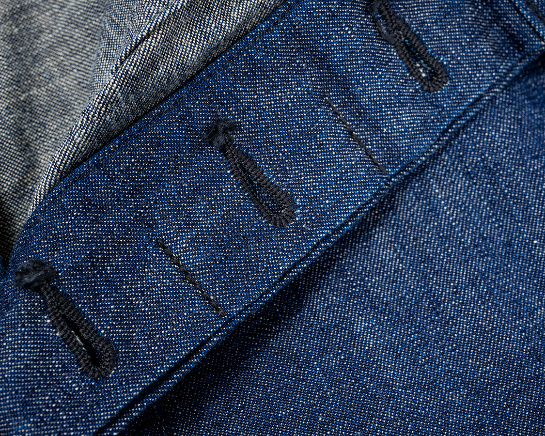 フロントはボタンフライ。比翼(ボタンホールの開いているパーツ)の端がロックではなく折り込んでいるのが特徴。