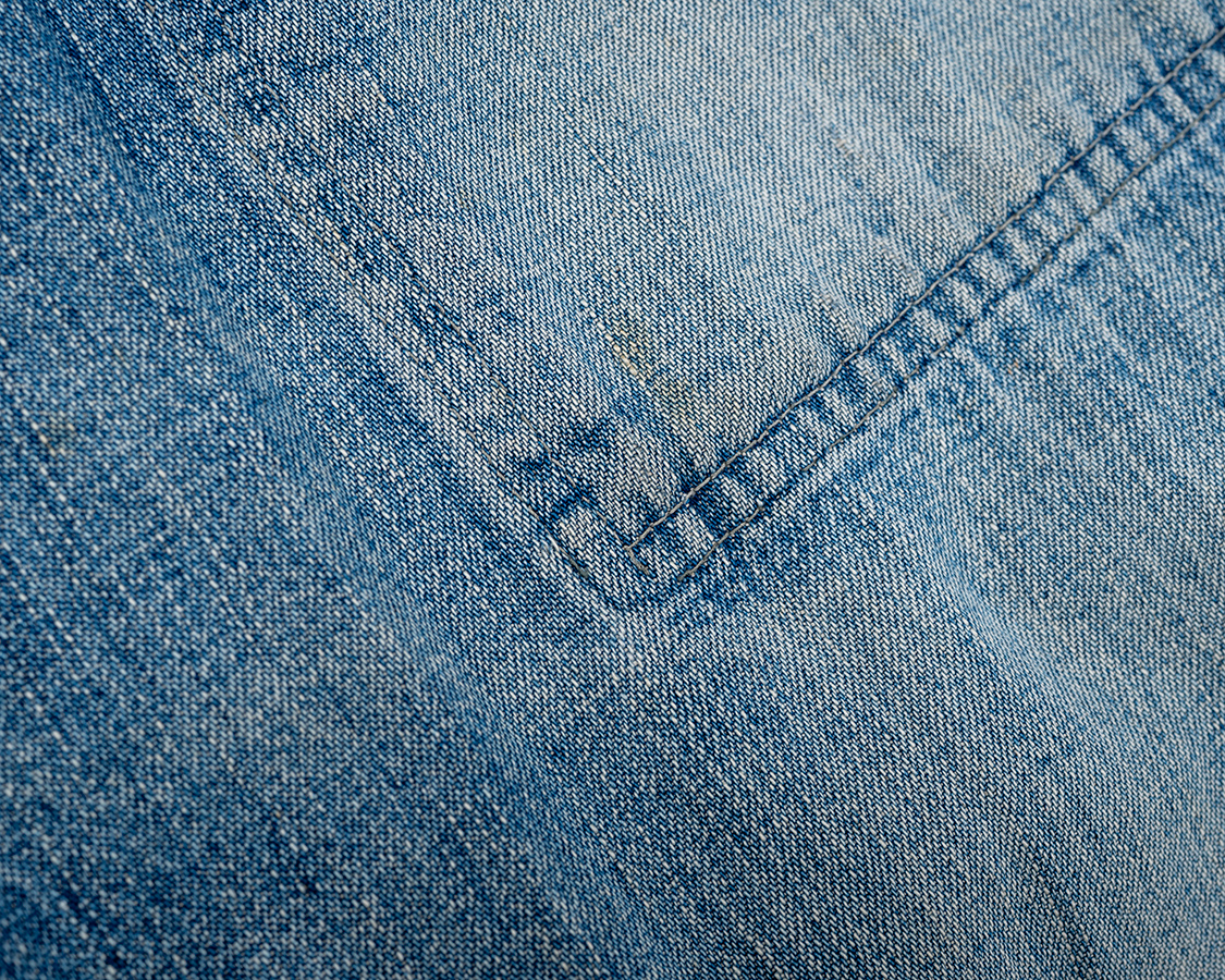 ダーツの地縫いが外れかかって、中の色落ちしていない部分がちらっと見えています。ポケットのカンヌキ、妙にポケットの口幅より広い。