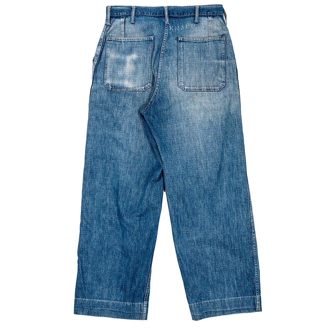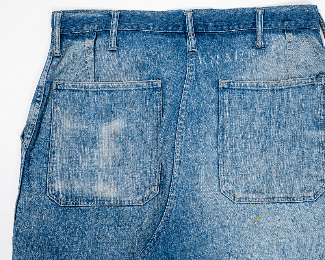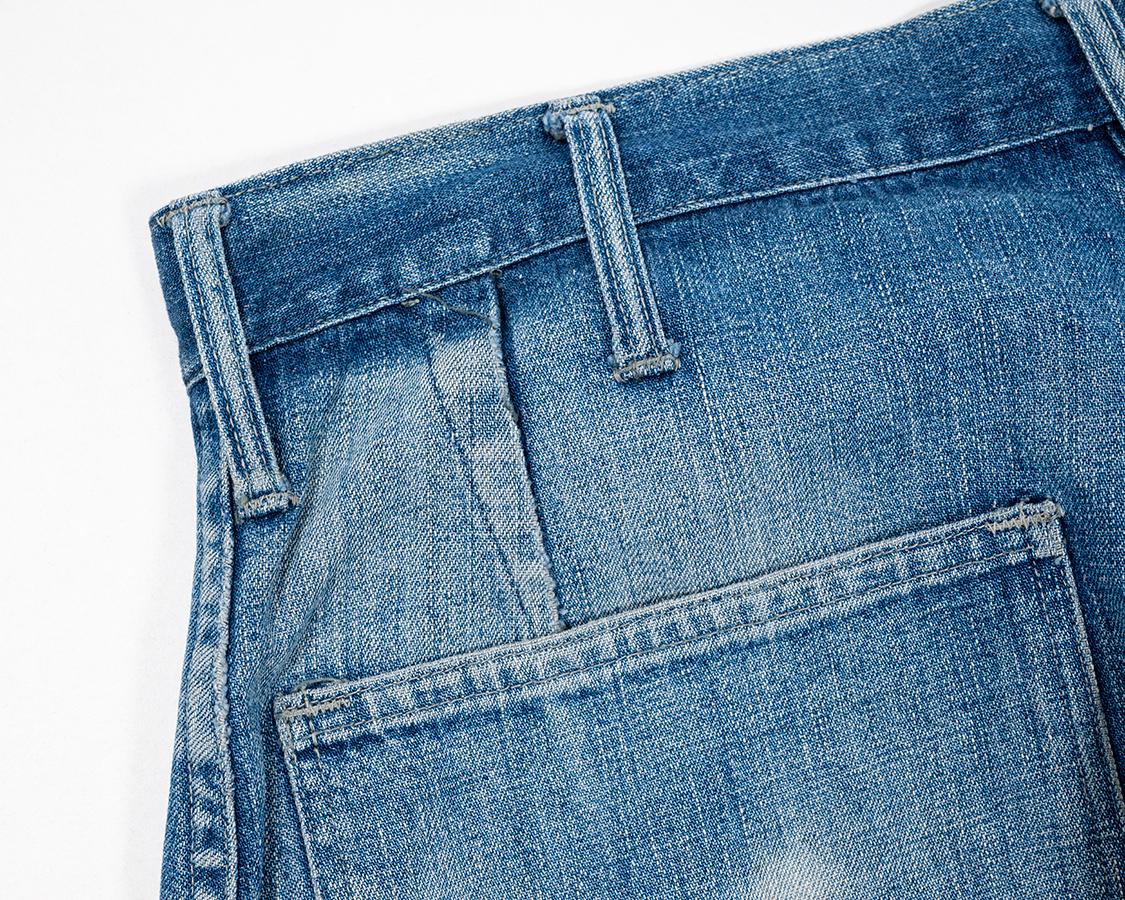 フロントの裏貼り付けポケット、背面のダーツ、フラップの無いポケット。ステッチ色もおそらく、最初はデニムとほぼ同系色だったはずが、デニムの色落ち・縫い糸の色落ちに差があるので濃淡が出てなんとも良い雰囲気。
