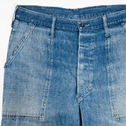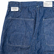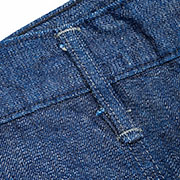 素材、デニムは10 オンス。ヨコ糸にブラウンがかった色味をつけているので、全体的にどす黒く見える。古いミリタリーデニムで見る仕様で、果たしてヨコ糸に色をわざわざつけたのか、それとも色がついているワタで作った糸だったから色がついて「しまった」のかはわかりません。が、確かに古いミリタリーデニムを見ると、全体がどす黒い。沈んだ色調で、 多少汚れても目立たない。そんな生地を真似して作った「Brown Back Denim」。