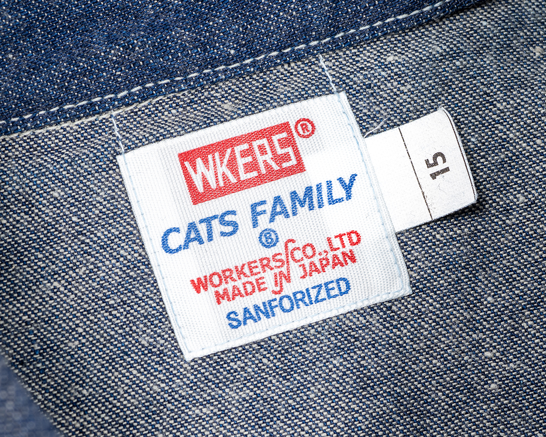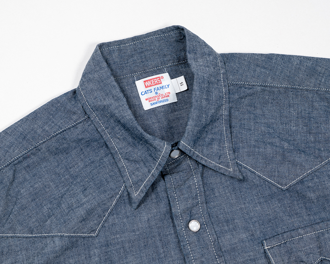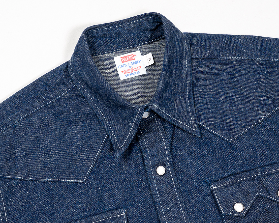 ロングポイント(襟がちょっと長め)がウェスタンシャツの特徴。やりすぎると着づらくなるので「ウェスタンらしさ」を感じるギリギリぐらいに。