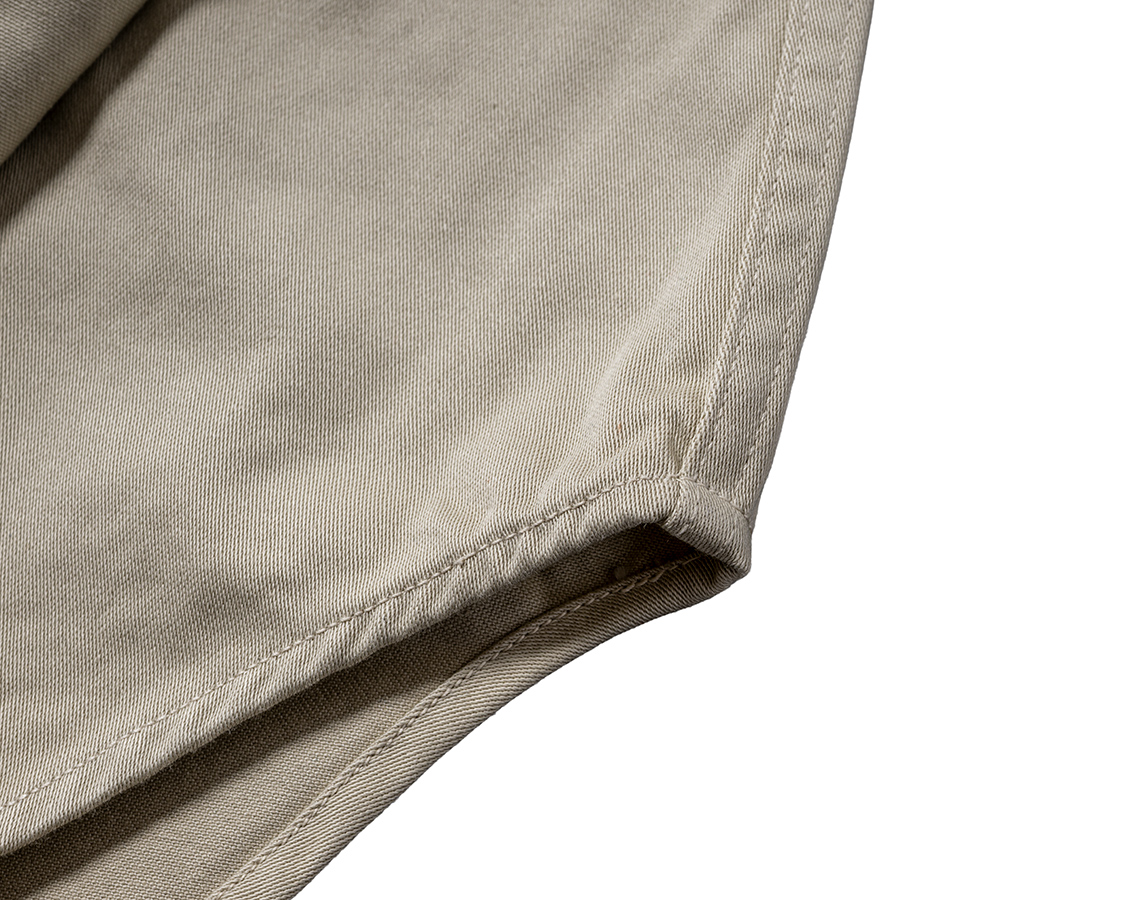 フロントから脇に向かっての切りあがり。ここのライン、シャツを作るときに非常に気になります。オリジナルは大体、着丈が長く、ここの切りあがりがぎゅ~っと激しい。ただ、それをそのままやると、日本人がタックアウトするにはきつい。着丈を短くすると、せっかくのラインが出づらくなる。