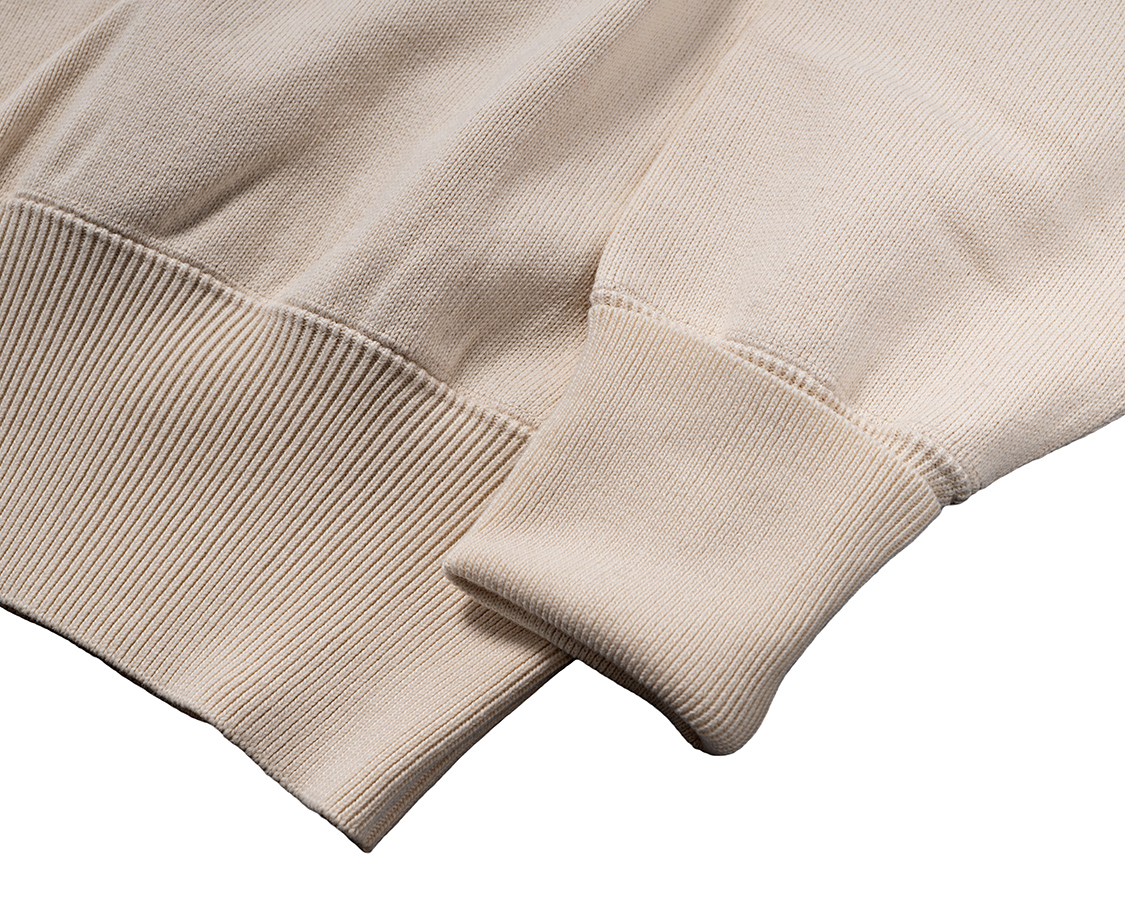リブは「総針」と呼ばれるもの。サドルショルダーの針抜きと比べると、違いが良くわかります。ここだけは、カットソーの丸編み機ではなく、セーターを作る横編み機で編んでいます。理由は、一部、編み出し部分(ほつれていかない編み止まっている部分)が必要なため。
