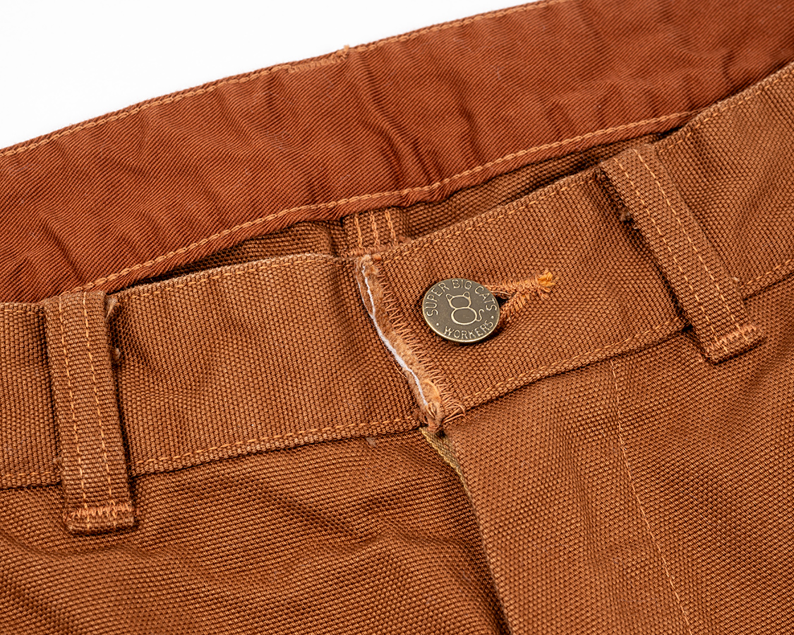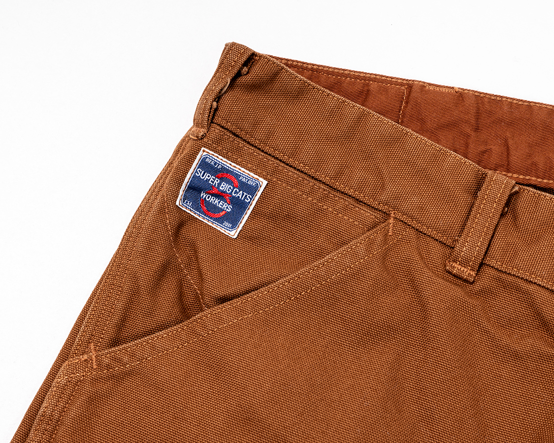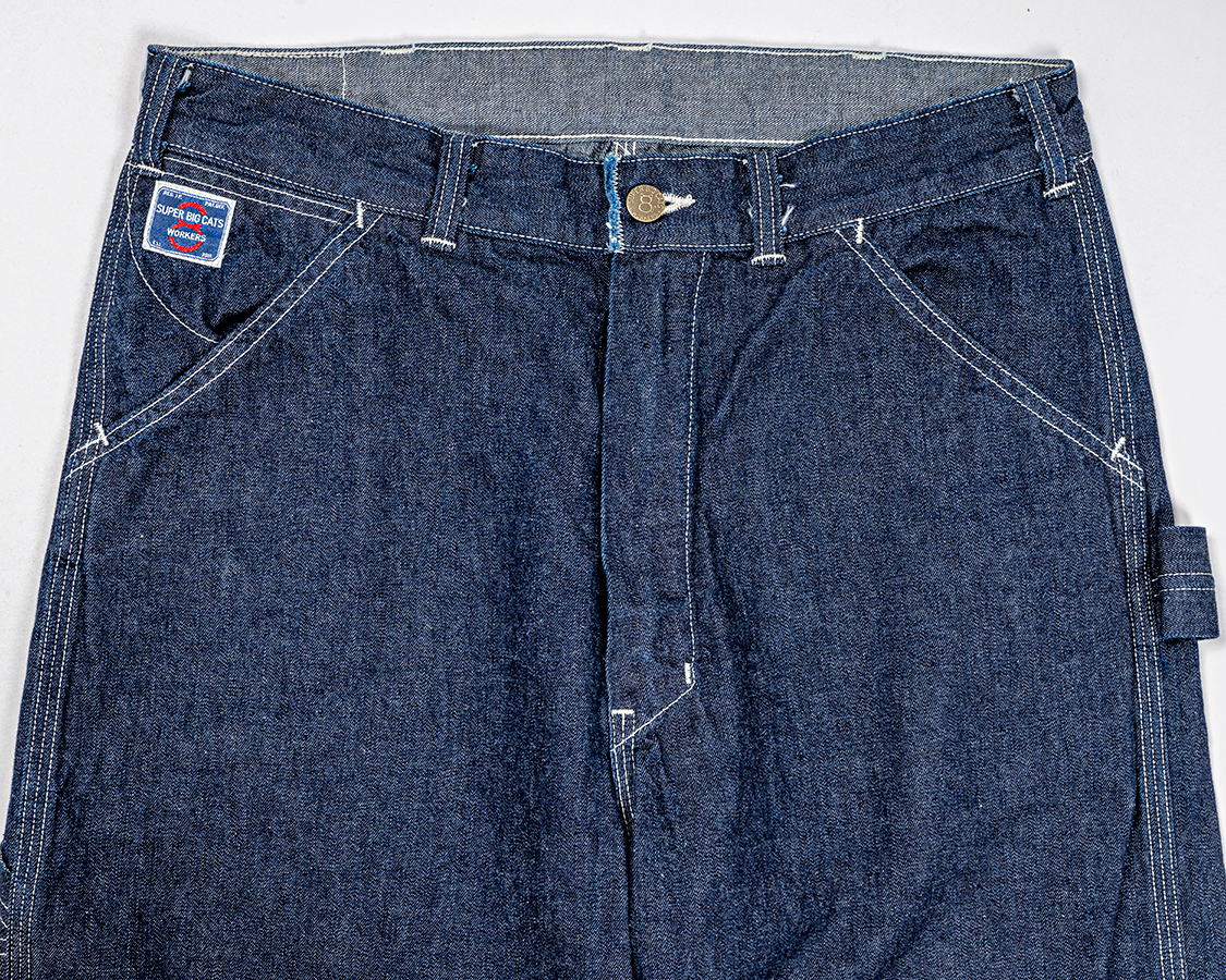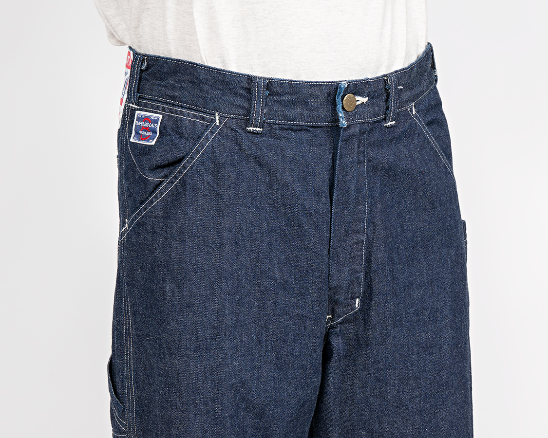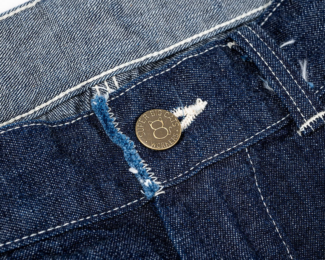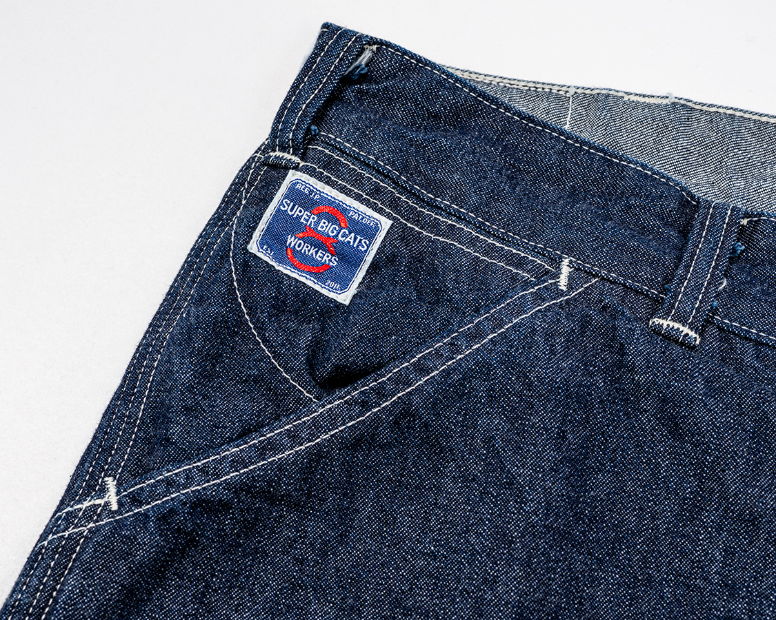 直線的なフロントポケット。コインポケットについたネーム。切りっぱなしの帯。