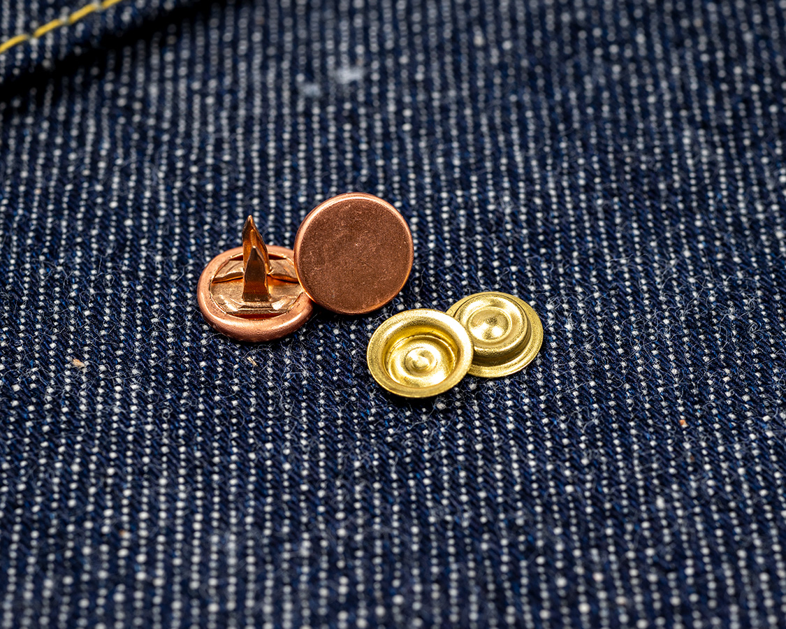 リベットは頭をつぶしています。本来は、頭がつぶれてしまう打ち具で一発で打ったのでしょうが、現代は、一度、通常の打ち具で打ってから、再度、頭をつぶすだけの打ち具でもう一度打つ。頭側が出っ張っていると、中でこすれて切れそうなので頭をつぶしています。