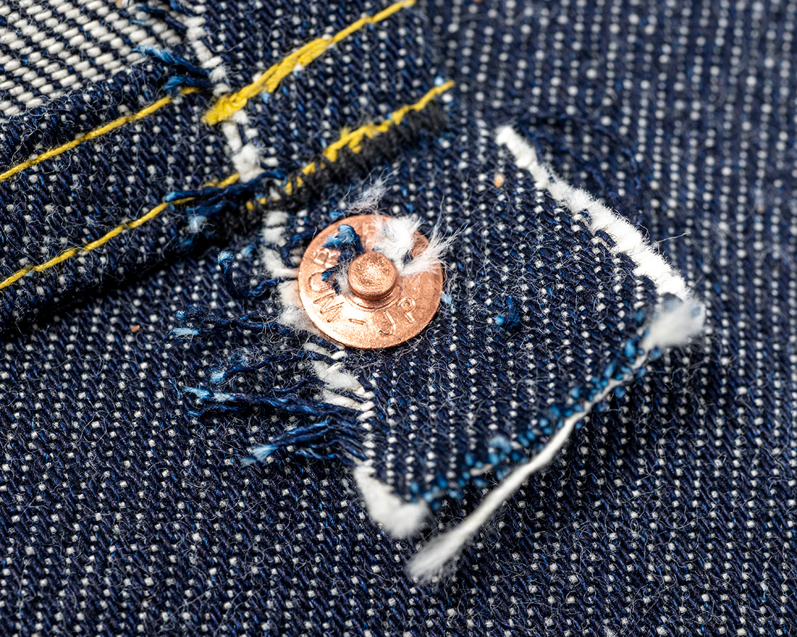 これが隠しリベットの縫い方。一部に切込みを入れてリベット+隠しカンヌキでポケットを止める。それから、ステッチを打つ・・・というやり方。