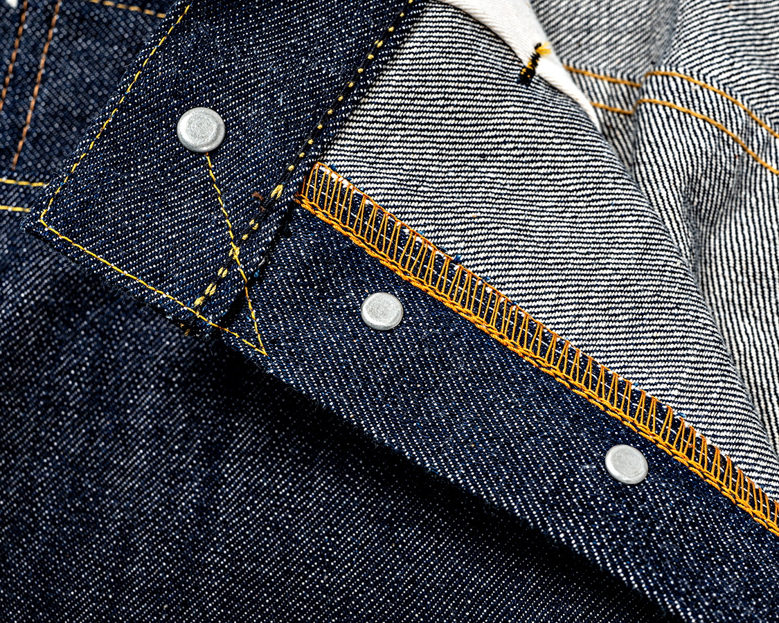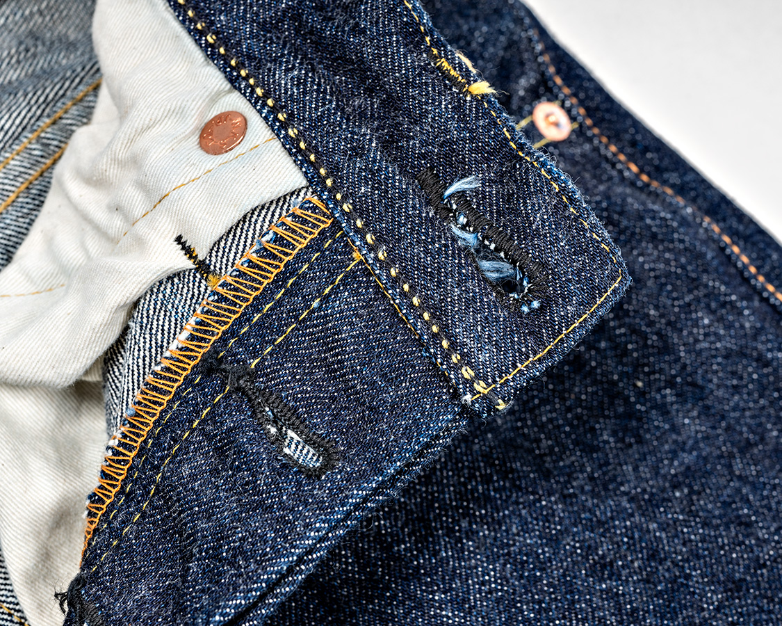 仕様としては、割るでもなく、巻き縫いでもなく、耳がある部分は割って、上の方が一枚でロックしてあってこの「クインチ」で倒しステッチを入れる。よく考えれば、他のパンツではなかなか見られない、ジーンズらしい仕様。