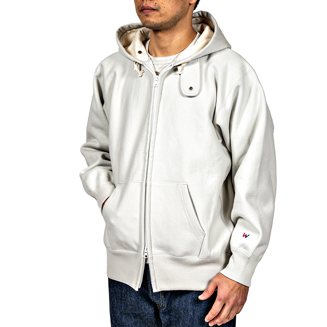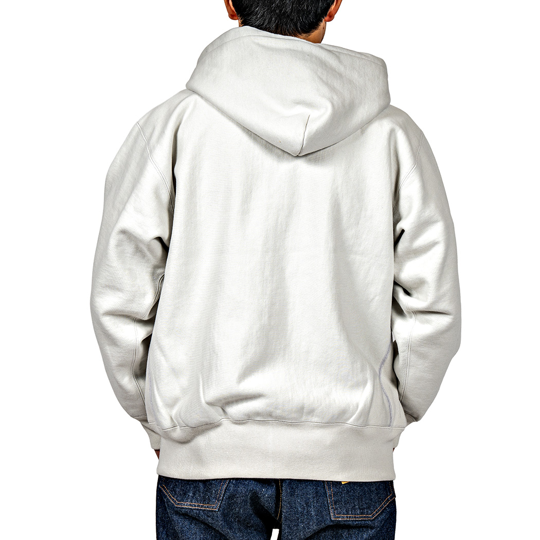 本家は化繊入り・カサッとしたスウェット生地に対し、WORKERS は表30番・中30番・裏7番の綿100。裏の糸ループを短く編み、 さらに起毛をかけた本格的冬用スウェットです。