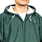 分厚くしなやかな生地で作ったパーカーはフードが後ろにでれ~っとならない。誰が着てもとても良く似合います。首元のタブはスナップ止め。