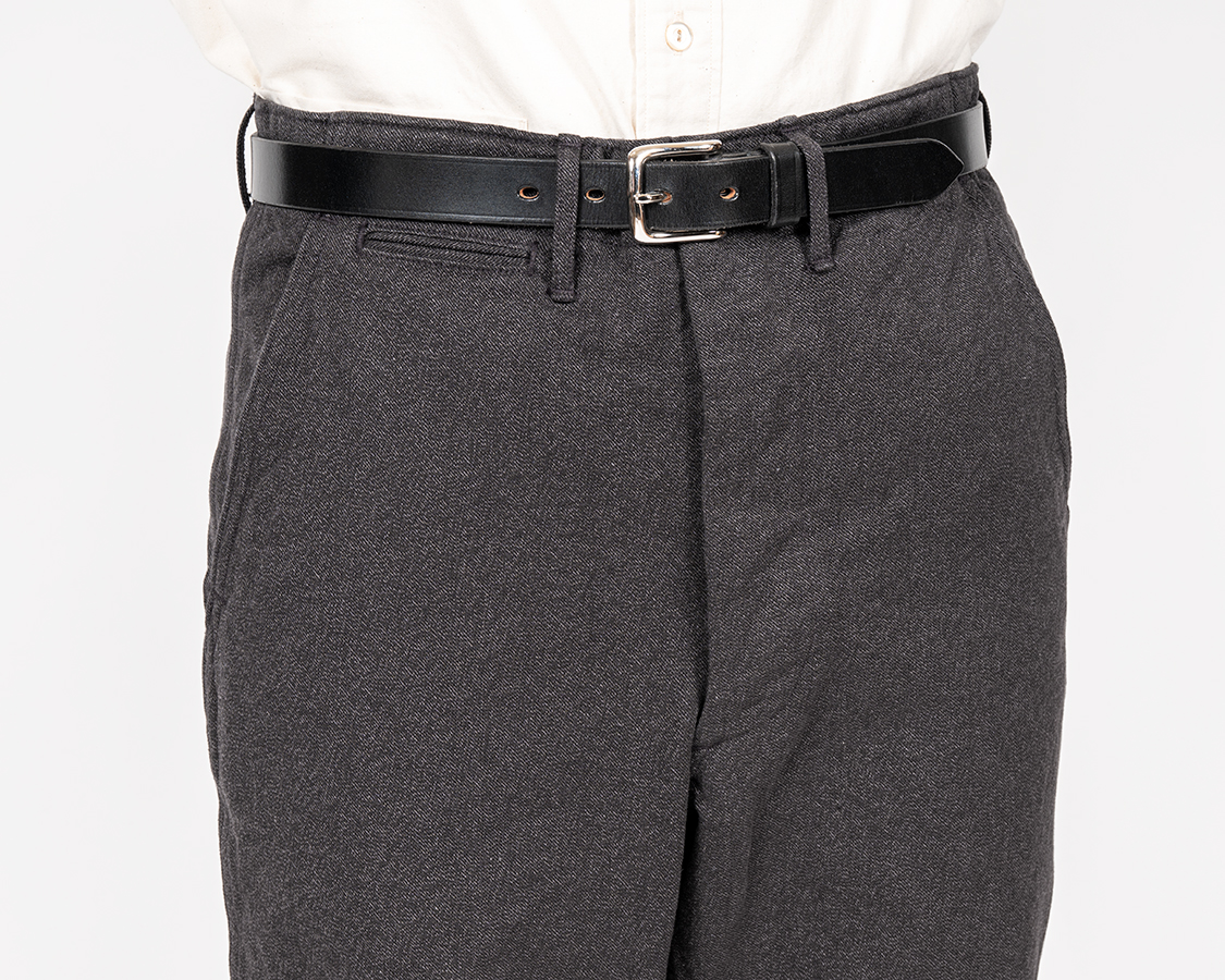 斜め切り替えポケット+細両玉のコインポケット。簡単そうで、この斜め切り替えを脇で巻き縫いが乗り越えるところ、厚みが極端に変わって縫うのが難しいのです。昔、自分で縫っても縫えないし、工場さんはみな嫌がるし。