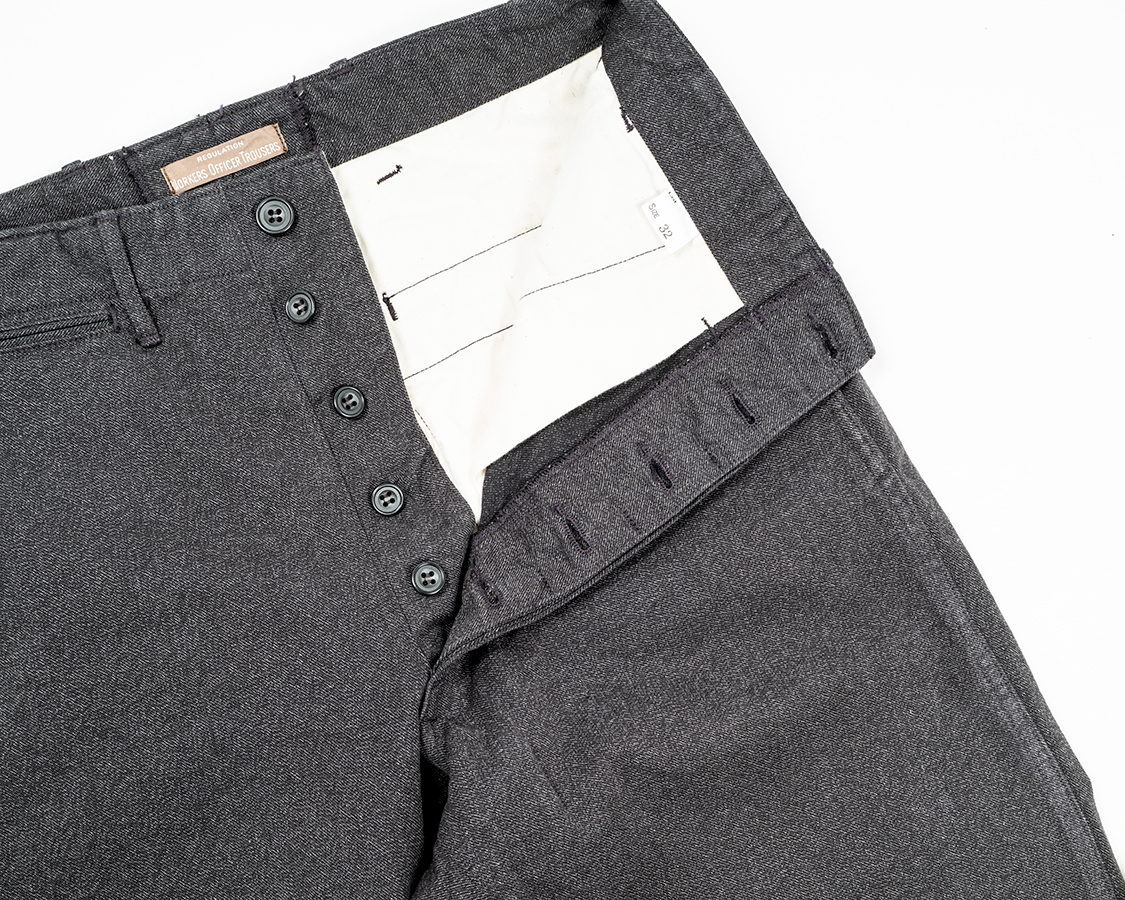 フロントボタンフライ、比翼止めステッチ有り。クラシックなトラウザーズの仕様。