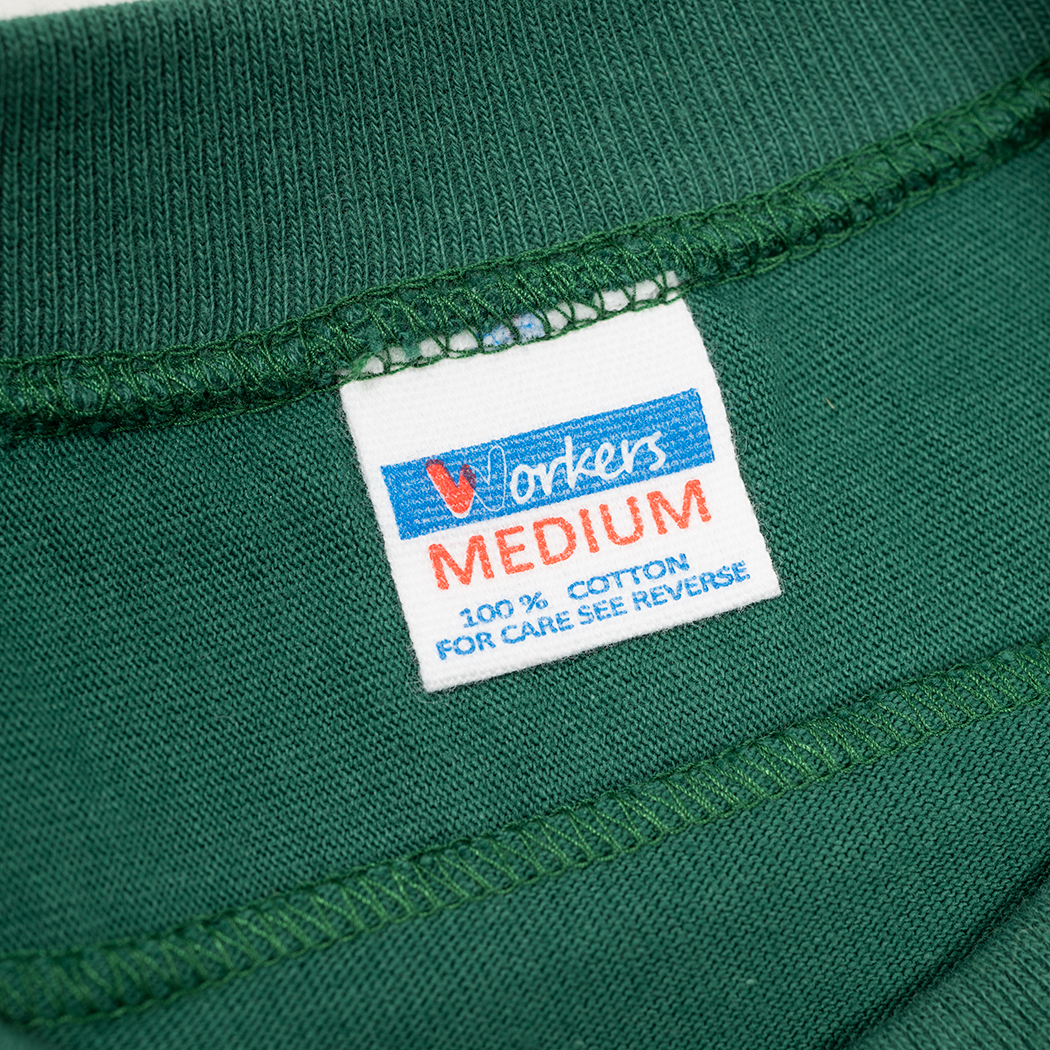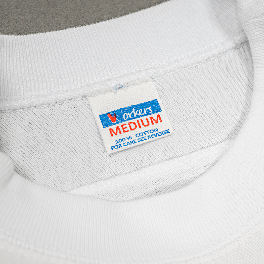 素材は16 番単糸の天竺。単糸、そう2PLY やボーダーが「双糸」に対し、糸1 本で編む「単糸」。糸の 撚り方向に生地自体が斜行(しゃこう)しています。もちろん、「セット」という工程である程度はまっすぐにしますが、 それでも完全には斜行が取れない。その若干ねじれた感じがビンテージのあのT シャツの感じでもあります。