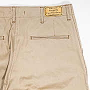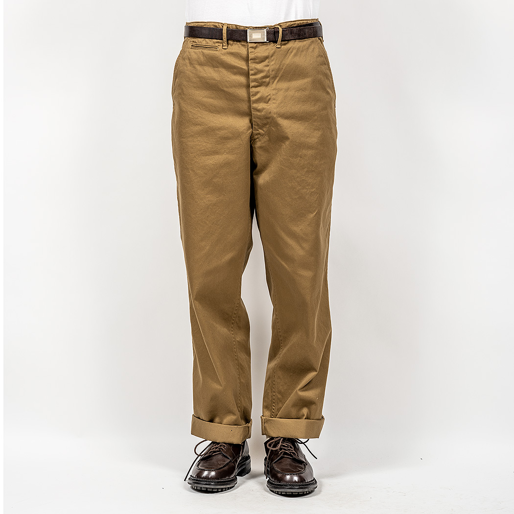 素材は定番のチノ 。USMC KhakiはWORKERS別注で、古着のUSMCと思われる茶系のベージュの個体から色を取ったもの。いわゆる「チノパン」のもう少し白いベージュとは違う。より土臭い雰囲気。