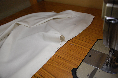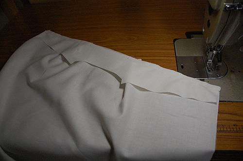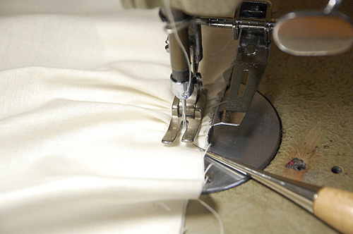 身頃を起こし、トンボを2.5ミリほど内側に寄せてステッチを打ちます。