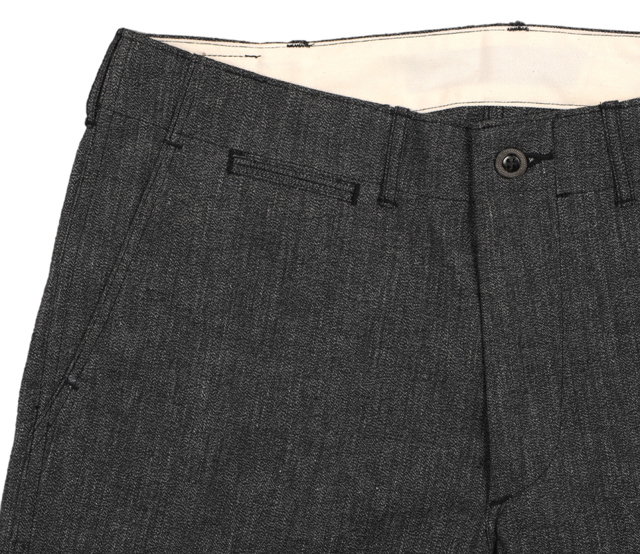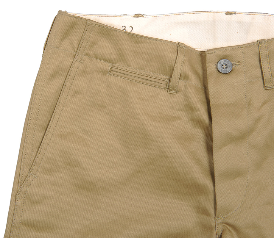 ジーンズなどと比べると細いベルトループ、これもカーキトラウザーの特徴です。