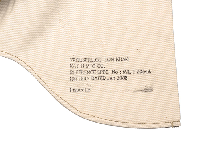 また、袋布の裏には、オリジナルのスペックラベルを参考に、このトラウザーがMIL-T-2064Aを参照して作られている事、K&T H MFG CO社製のものであること、今回使用した型紙を作った昨年の1月の日付けが記載されています。