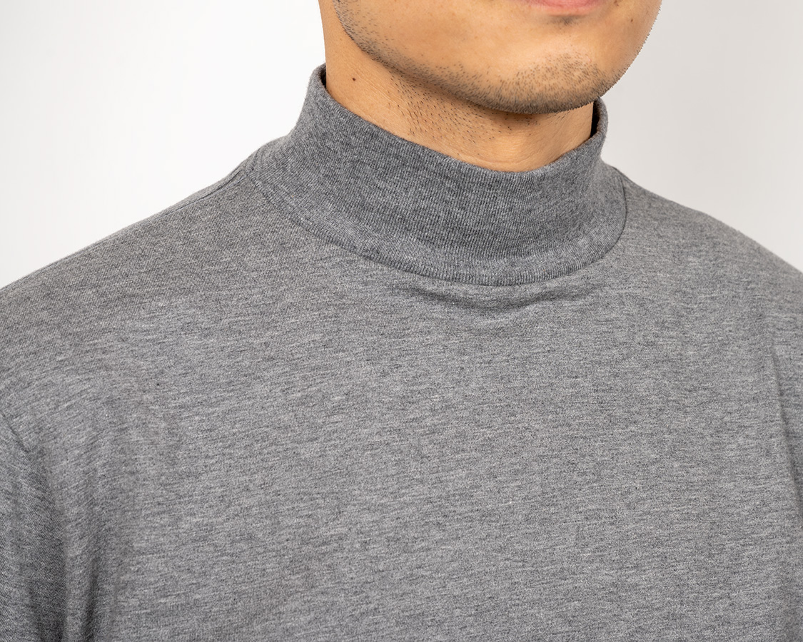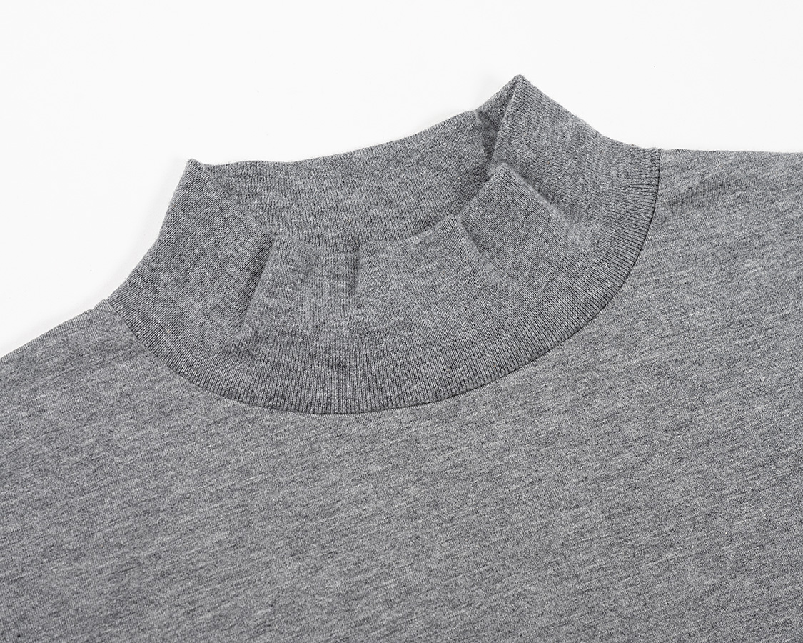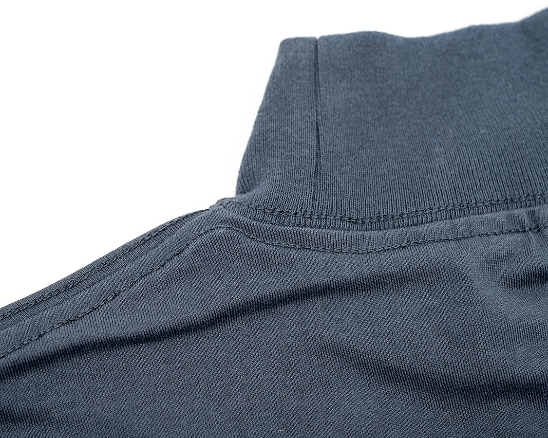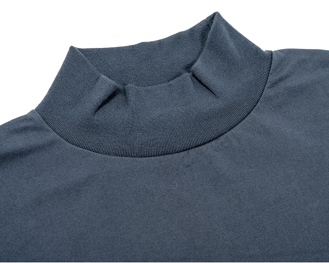 モックのポイントは「頭は通る、でも首にしっかり沿うネック」。そのために、身頃より伸縮性が良いフライス(リブ)を首に使う。それを、身頃のネックより小さいものを伸ばしながらつける。結果、ビヨンと戻る。カットソーは、生地の伸縮率の違いを意識してそれを伸ばしながらつけることで、「ここを通る時は伸びるけど、そのあとは戻る」が大事です。
