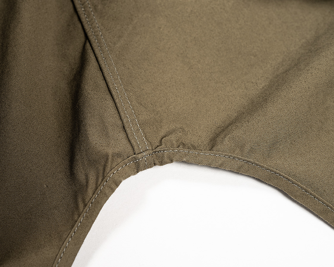 総社縫製さんの腕の見せ所。脇の極細折伏せ縫い。これもきれいですが、その折伏せで分厚くなった部分を見事に三巻しています。脇に向かって、かなりカーブがきついのにこの仕上がり。昔は私も、色々縫ってみましたが一番苦手だったのがこの三巻でした。ラッパ(金具)を使いながら、この脇のような分厚い部分はそれをはずしたりして縫います。うまい。 |