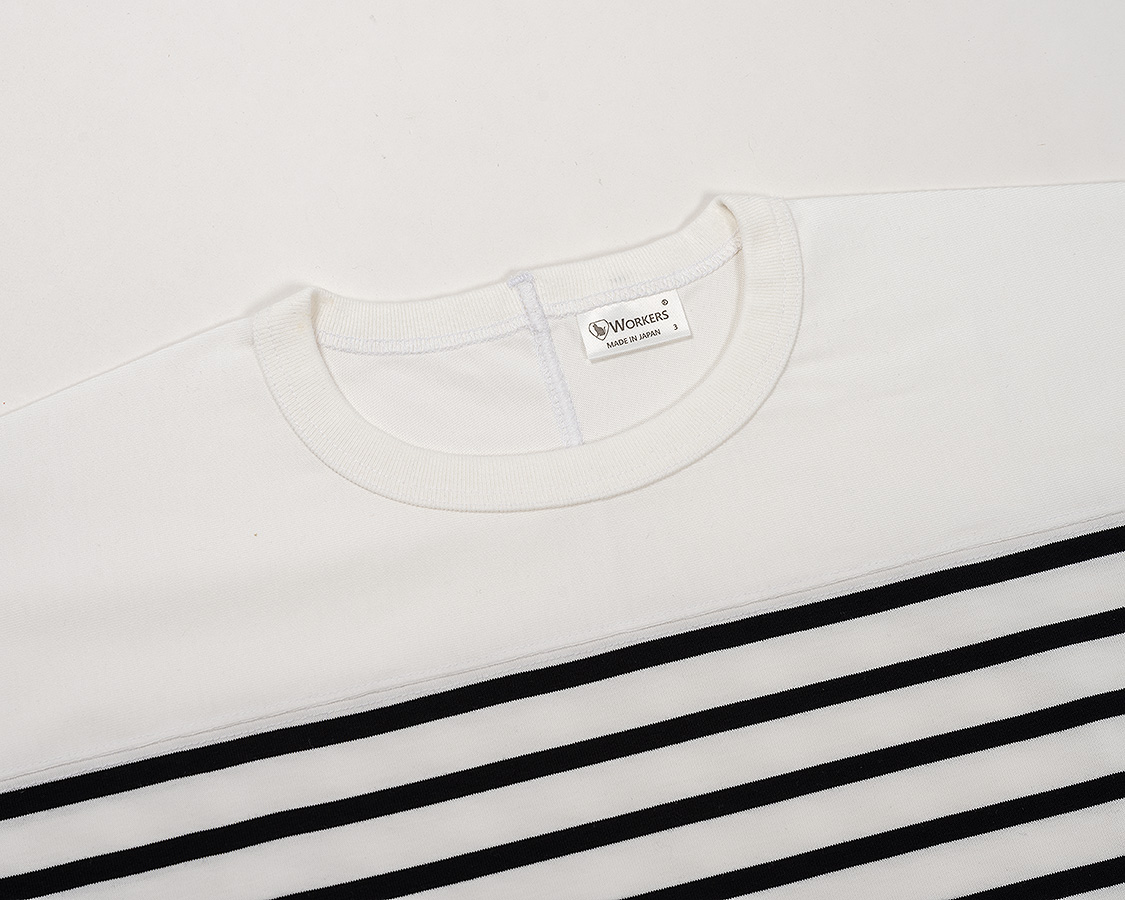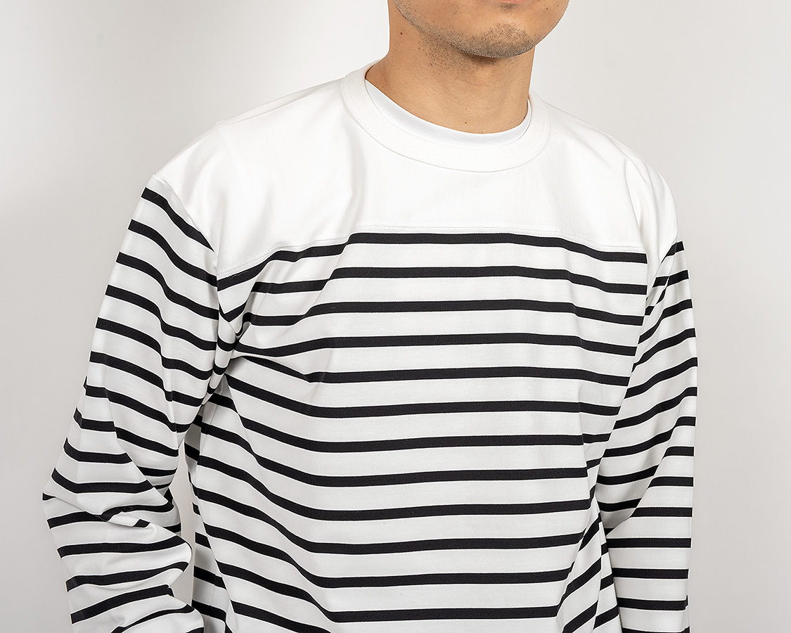 着ると、パネルボーダーやバスクと呼ばれるような、首回りがボーダー柄の無いデザイン。シルエット自体は、Crew NeckのボーダーTと同じなので、同サイズを選んでいただけます。
