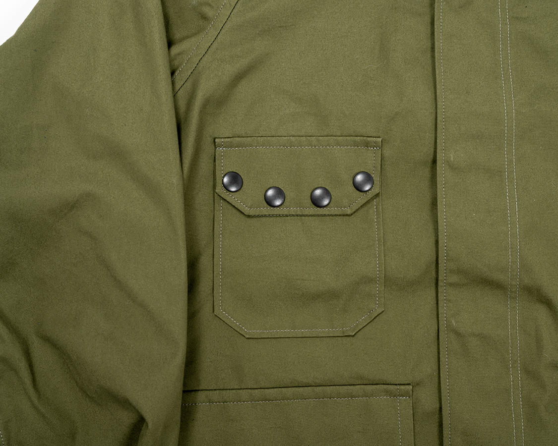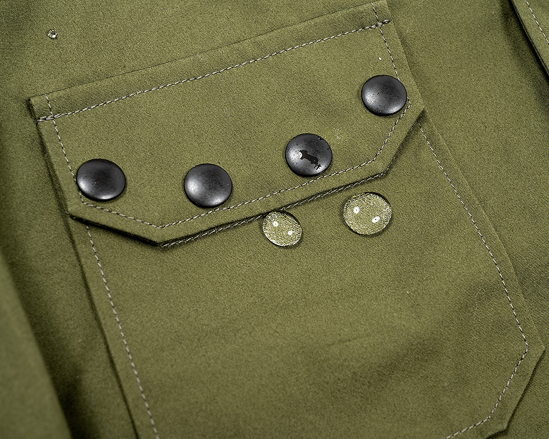 胸にスナップをたくさん打ったフラップポケット。オリジナルは縦方向にフラップだけがついていて、一説にはヘッドセットのコードを止めると言われています。そのままだと、使い道が無いので角度を変えてポケットのフラップに転用。