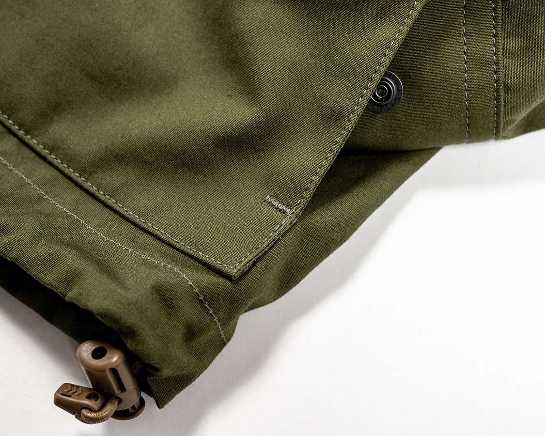 フロントはスナップ。トップが露出、身頃側は隠し。オリジナルがプルオーバーでフロントにスナップは無いのでその雰囲気をできるだけ再現して。