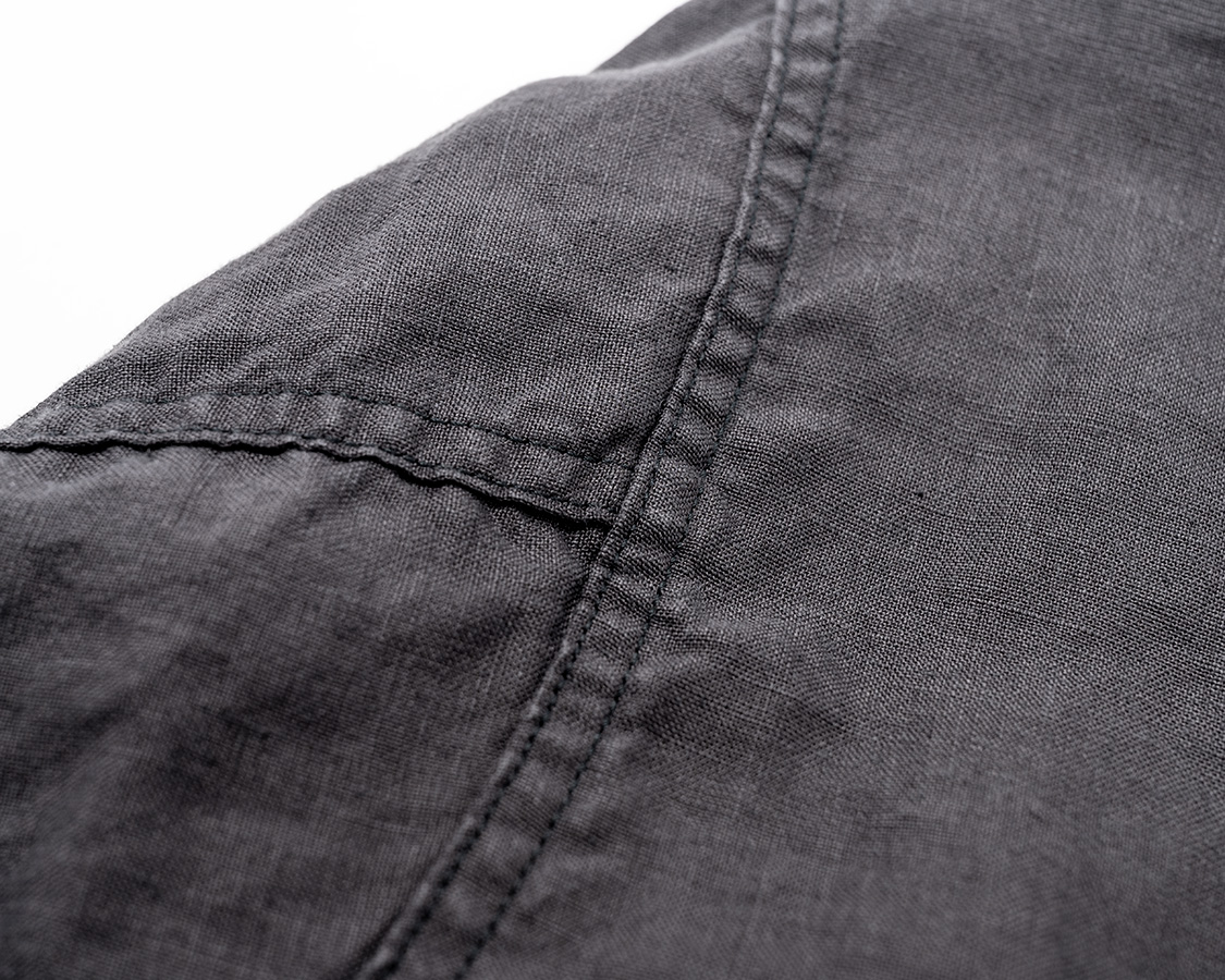 リネンのパッカリング具合。反応染めですが、こすれた部分が若干毛羽が立ち陰影が出ています。