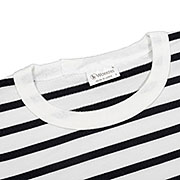 形は、クルーネックが長袖・ 半そで。こちらは定番。首のリブをがっしり厚い物にして、ボーダーの濃色部分が透けづらいように。ヘンリーネックは、 昨季、厚手のカットソーでも作った中心からオフセットしたもの。ボタンを開ければ着脱ぎが楽。締めれば首回りはしっかり収まる。カットソーを作る時の命題 「頭は通る、でも首回りにはしっかりフィットする」の一つの回答がヘンリーネックです。