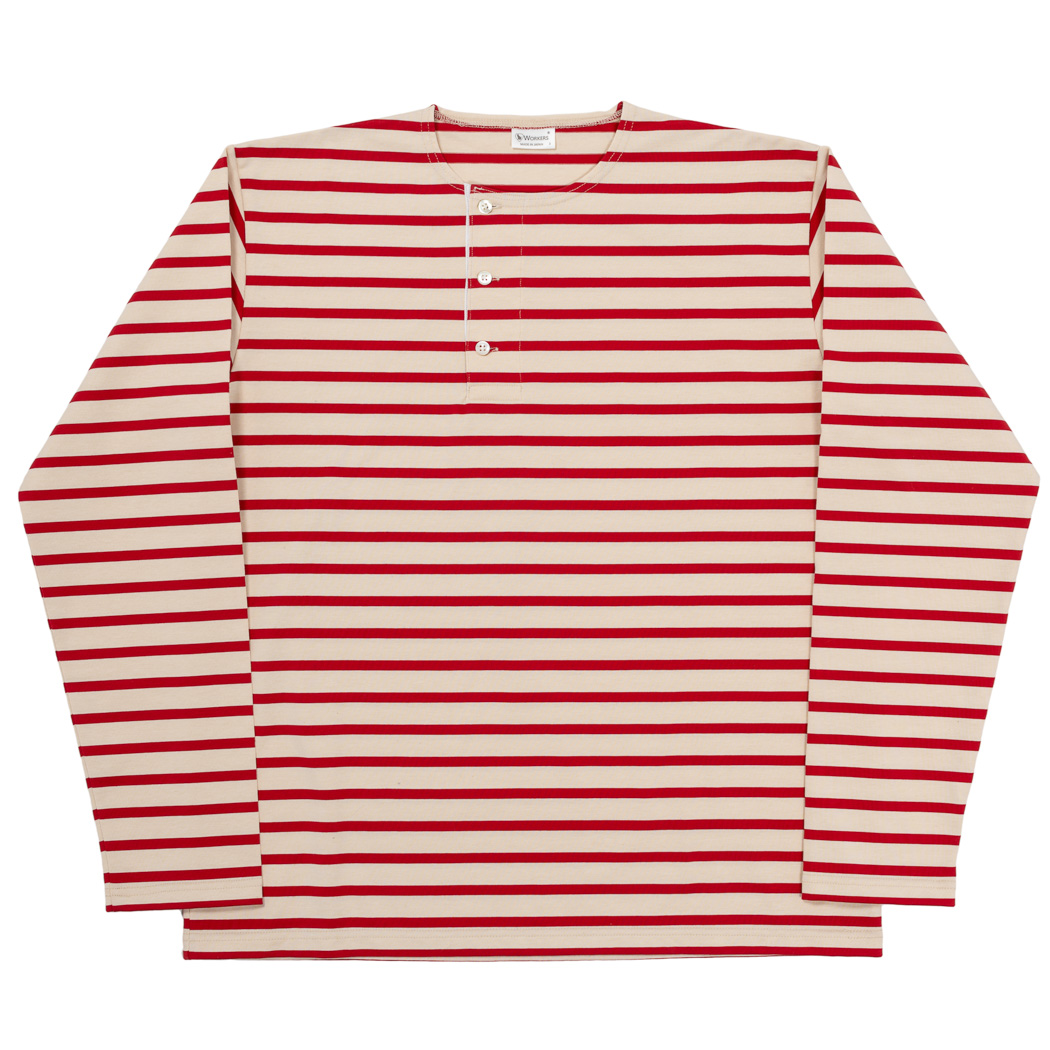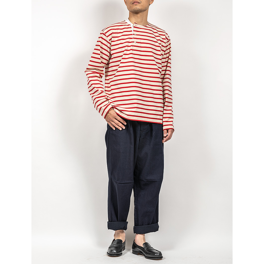形は、クルーネックが長袖・ 半そで。こちらは定番。首のリブをがっしり厚い物にして、ボーダーの濃色部分が透けづらいように。ヘンリーネックは、 昨季、厚手のカットソーでも作った中心からオフセットしたもの。ボタンを開ければ着脱ぎが楽。締めれば首回りはしっかり収まる。カットソーを作る時の命題 「頭は通る、でも首回りにはしっかりフィットする」の一つの回答がヘンリーネックです。