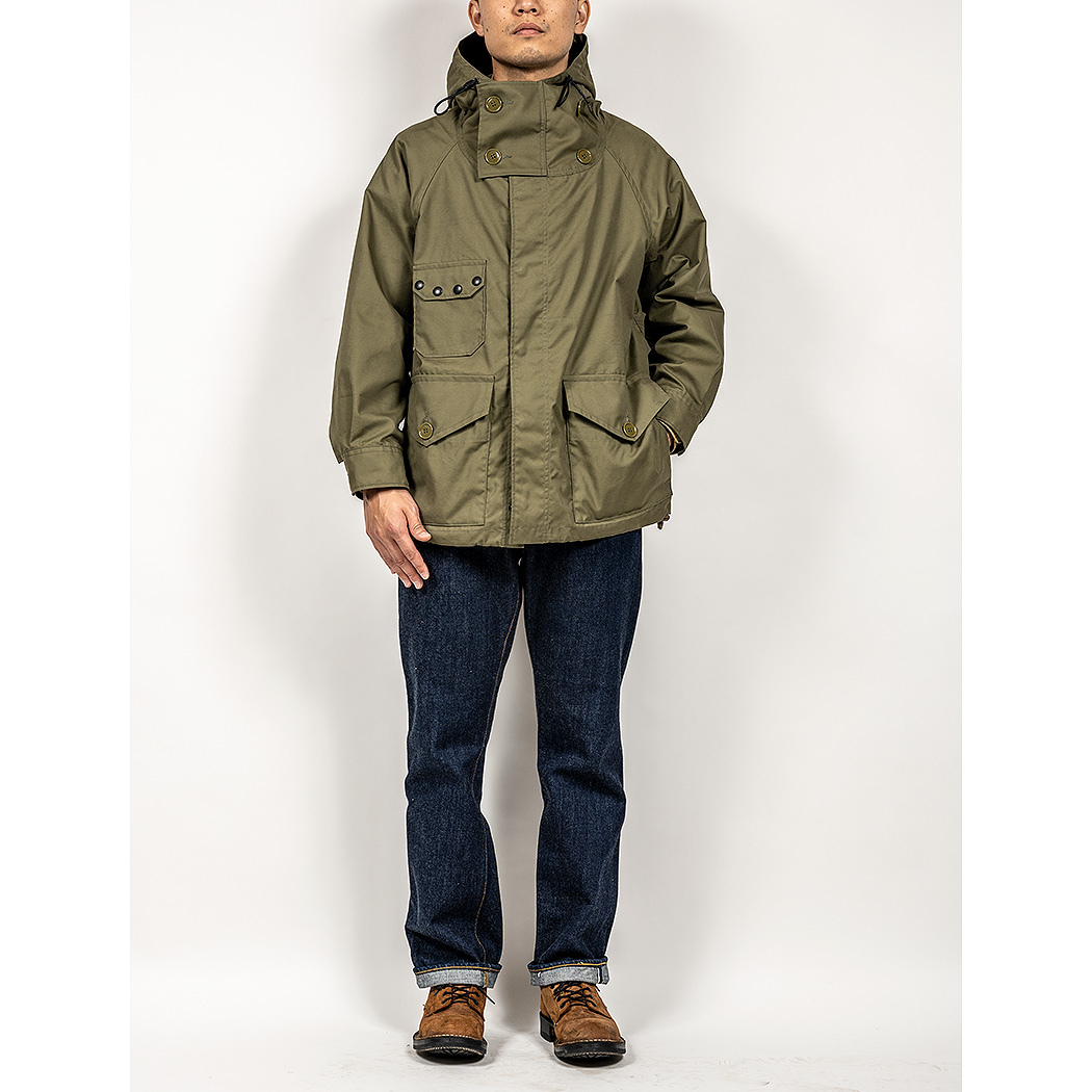 WORKERS版は使い勝手を考えフロントスナップに変更。腰ポケットは上・脇から別々の部屋に手が入る。「ハンドウォーマー」にもなる仕様。右胸のポケット、4 個スナップは元ネタのタブからデザインを転用。袖口はおなじみ、YANK風カフスで袖にタックを入れて肘の横幅を出しています。この肘あたりが昔のWORKERS はもっと細かった!今は、時代に求められる雰囲気に合わせてシルエットを変え、それに伴い、仕様も変えています。裾はゴムスピンドルを入れ、脇側