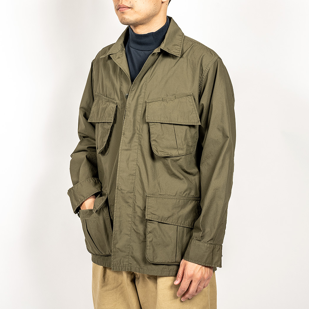 21FW から継続してファティーグジャケット。変更点はポケット。胸脇側に向かってマチが無くなる仕様。ポケットの形自体も変え、21FW とは別のオリジナル個体を参考にパターンをひき直しました。