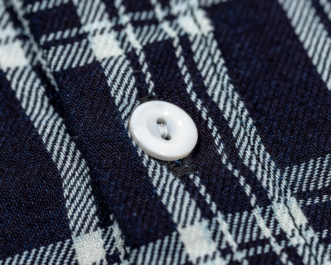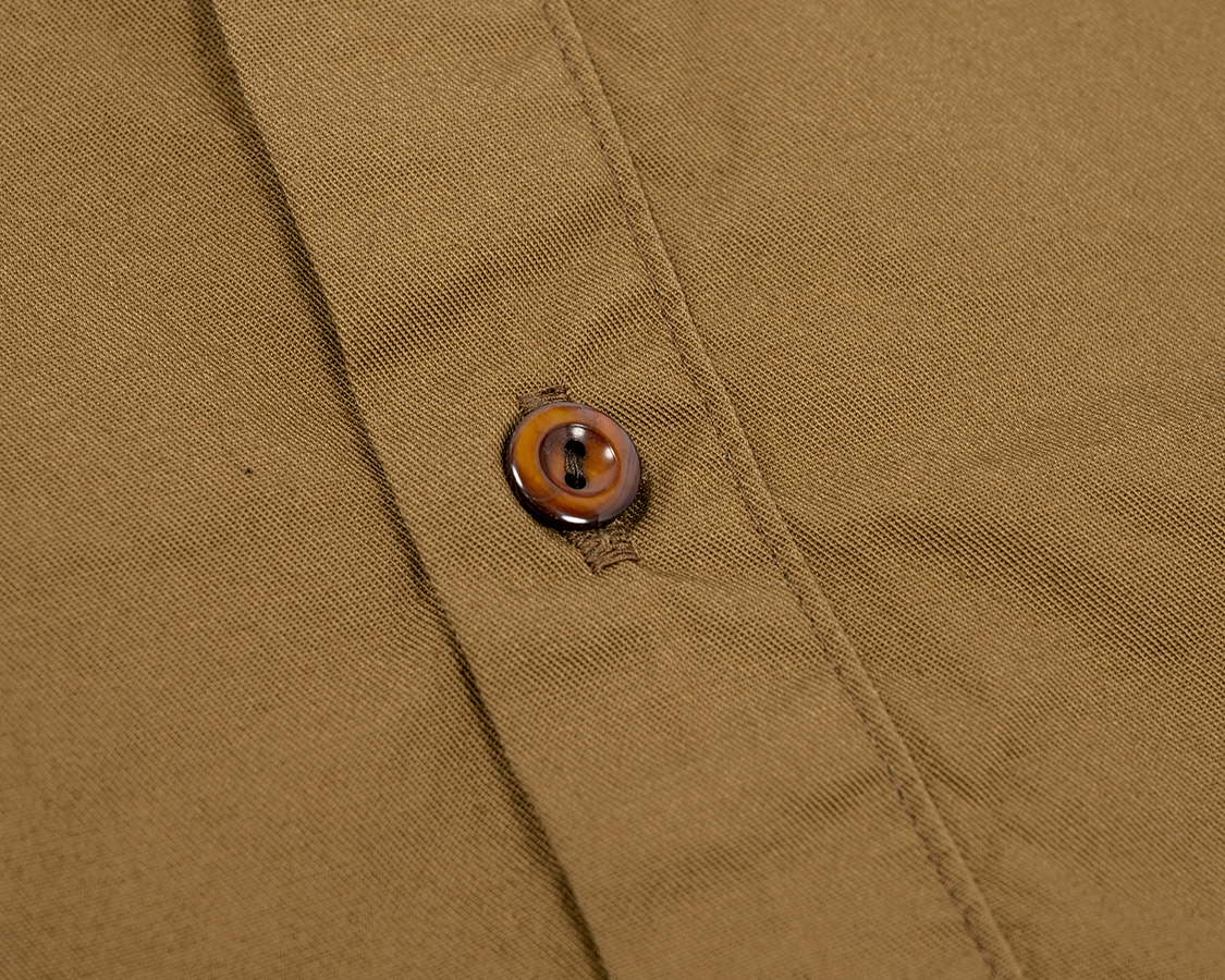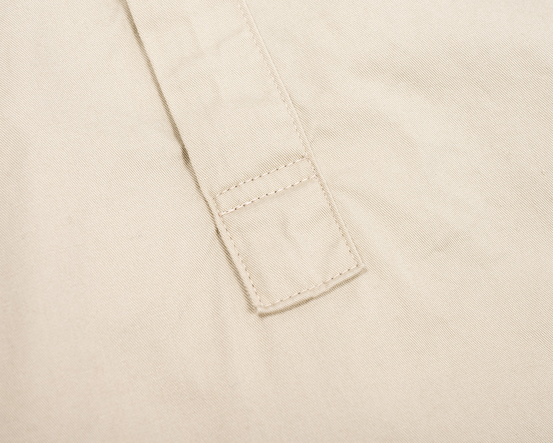 フロントはプルオーバー。チェーンステッチやラッパ(金具)は使わないで、完全に手作業で作られています。このシャツのシンプルな雰囲気によく合った仕様。