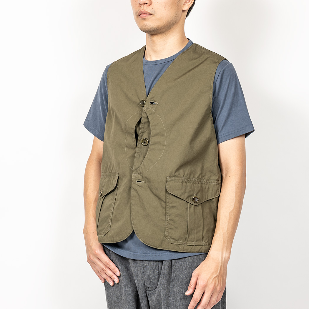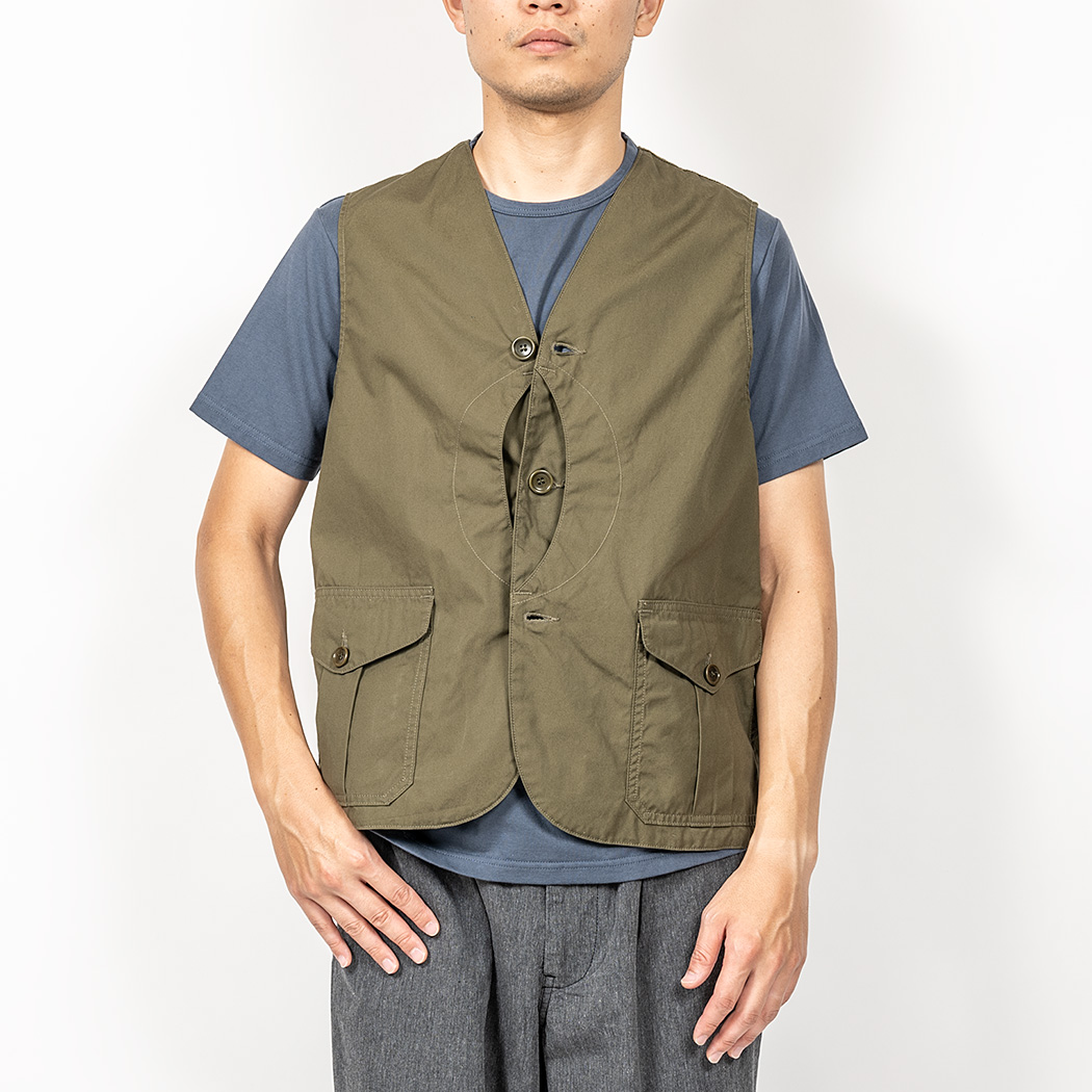 腰の二室ポケット、フロントの三日月型ポケット、内ポケットも左右に二つポケッ ト。フロント・バック共に裏地付。本来、ハンティングで獲物を入れたり、道具を入れて両手をあけるための「道具服」で、 WORKERS 版も「着るバッグ」といった雰囲気。