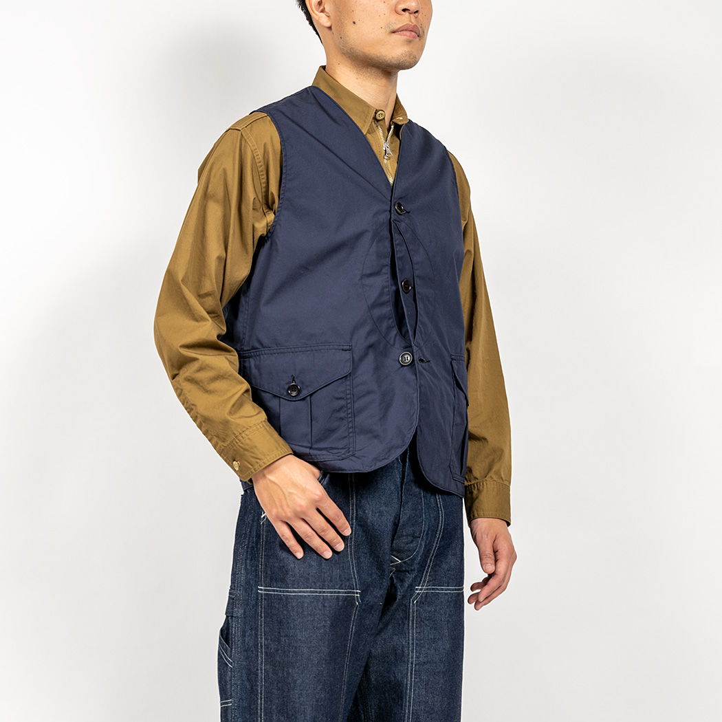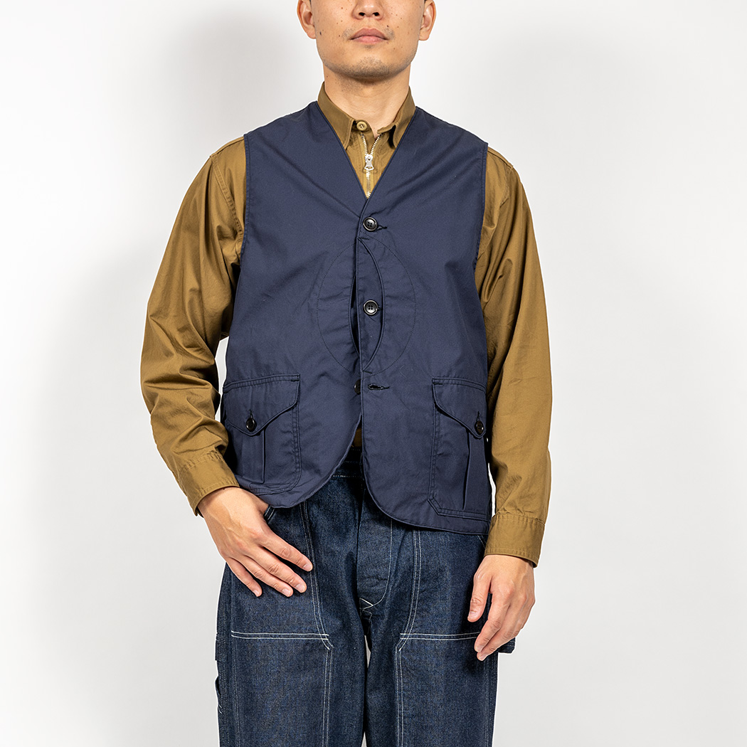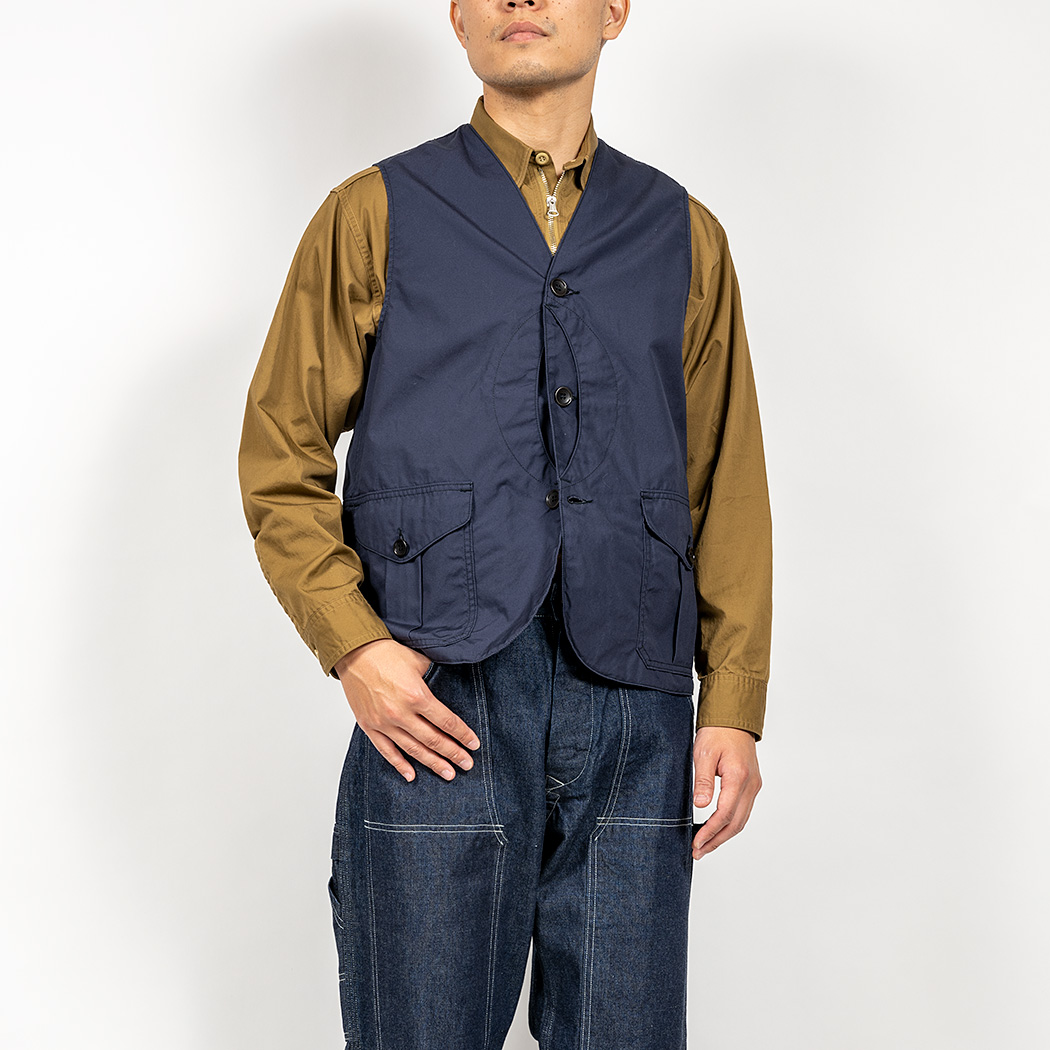 腰の二室ポケット、フロントの三日月型ポケット、内ポケットも左右に二つポケッ ト。フロント・バック共に裏地付。本来、ハンティングで獲物を入れたり、道具を入れて両手をあけるための「道具服」で、 WORKERS 版も「着るバッグ」といった雰囲気。