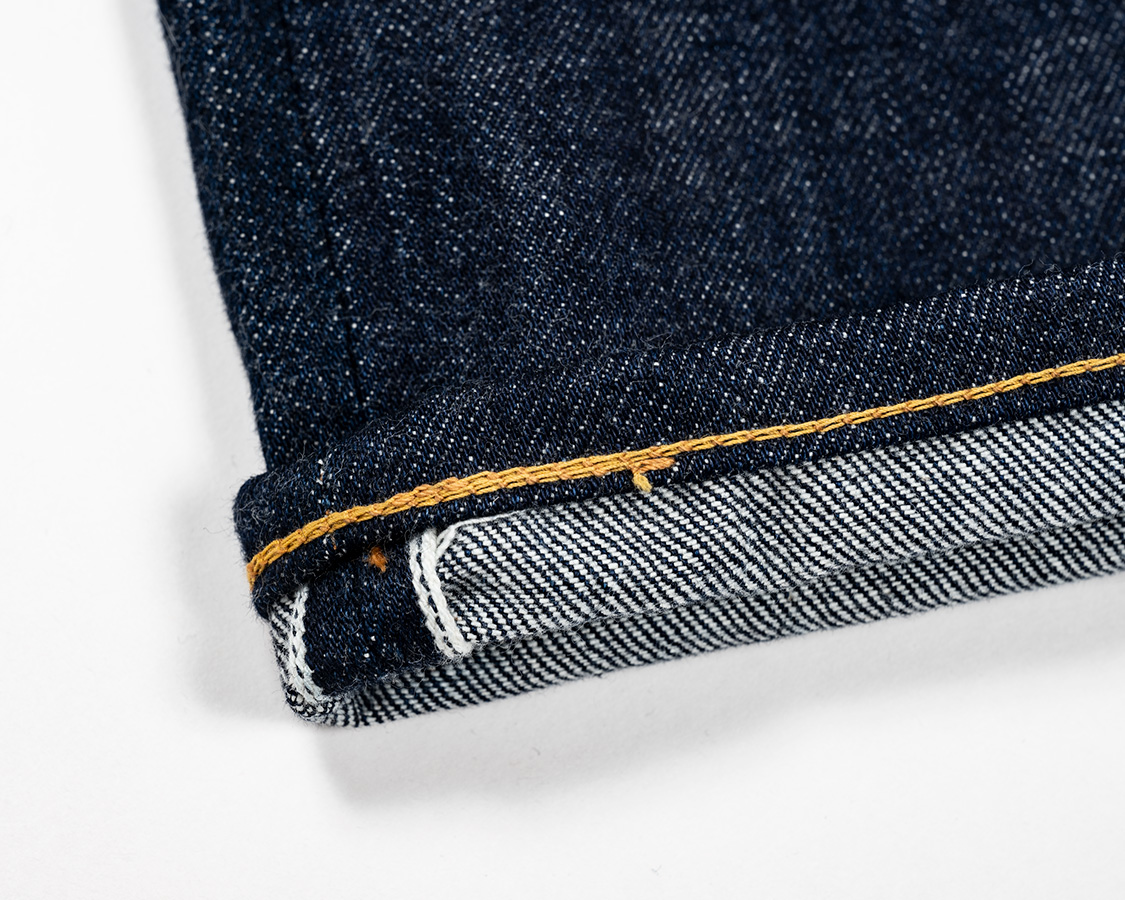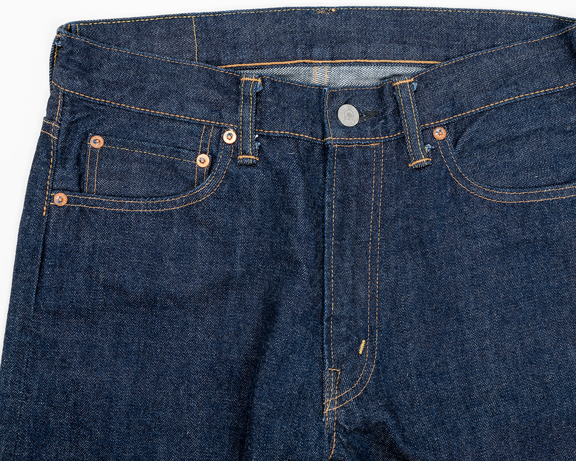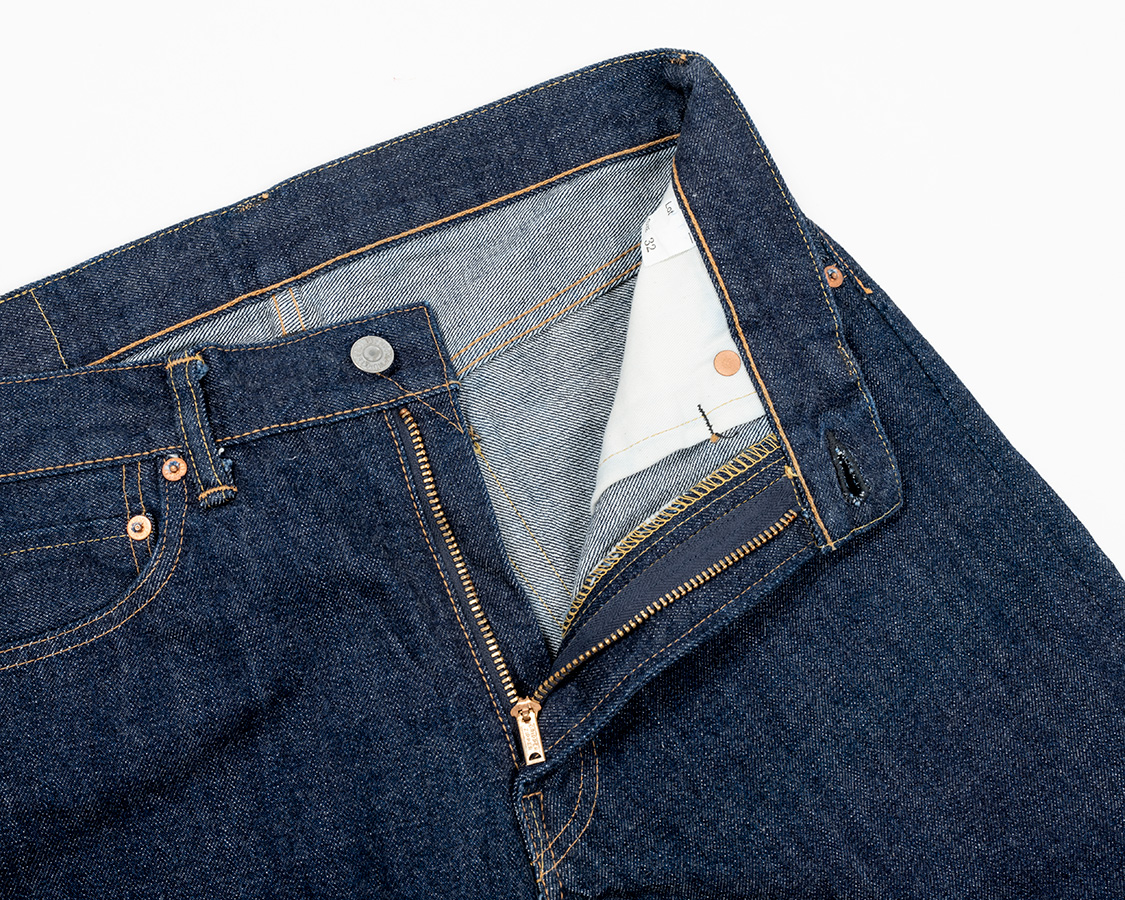 フロント、Lot 802 Zipperのロング版と同じグリッパージッパー。生地にサンフォ(防縮)が入っているので、ファスナーがうねうねに成っていません。防縮無しの生地にファスナーをつけると、ファスナーは縮まない、生地は縮もうとするのでうねうねと波打ちます。