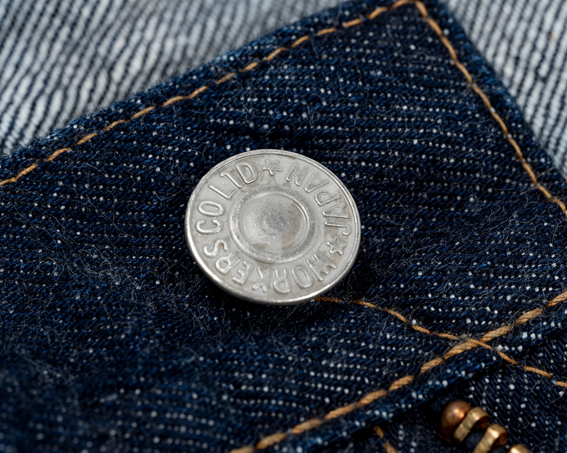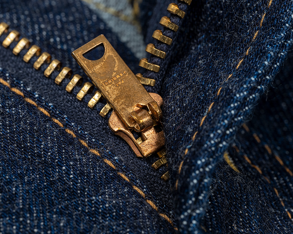 タックボタンは通称ジンク、亜鉛合金。リベットは胴。どちらもYKKにオリジナルのデザインで作ってもらった物です。ファスナーはいかにもアメリカっぽいですが、国産です。