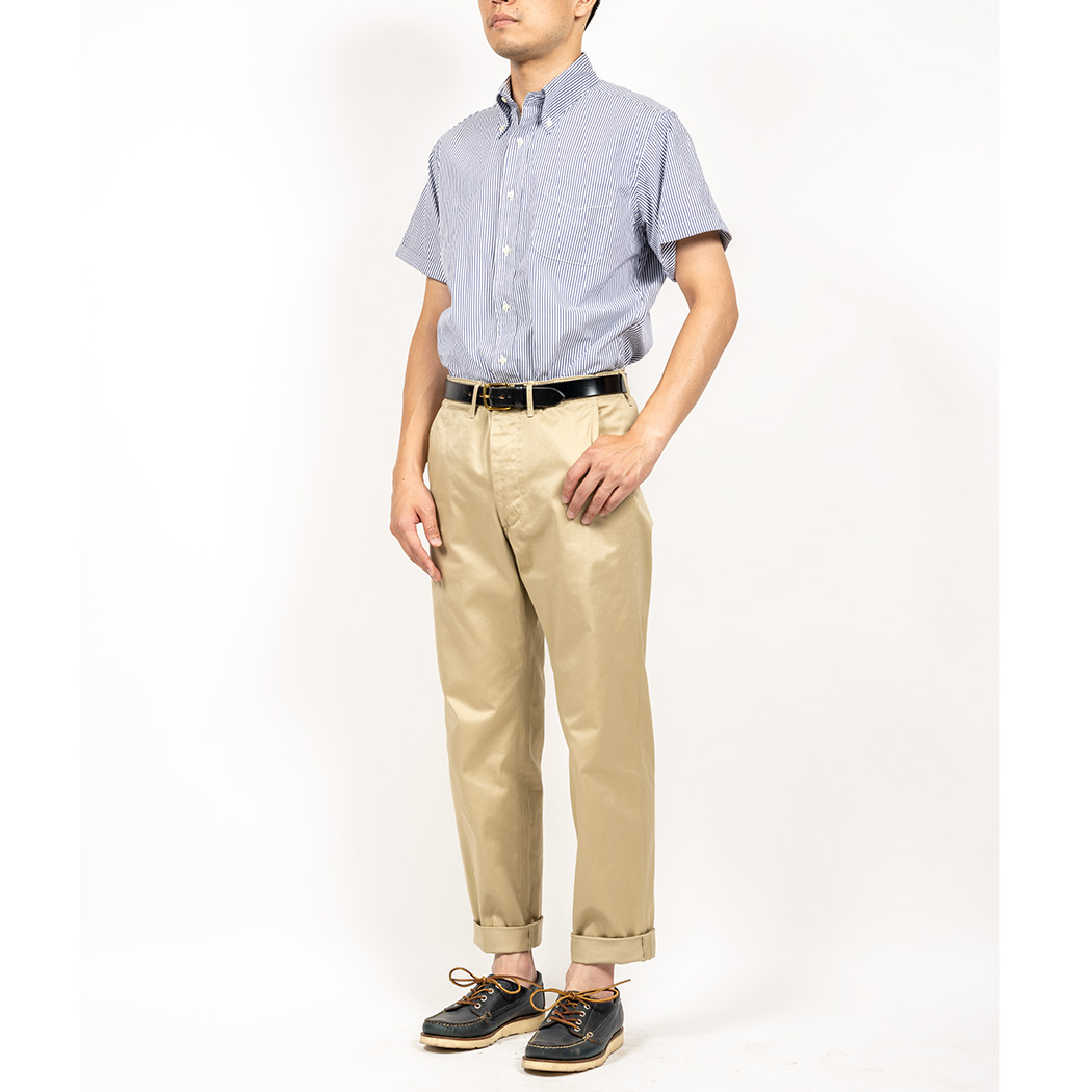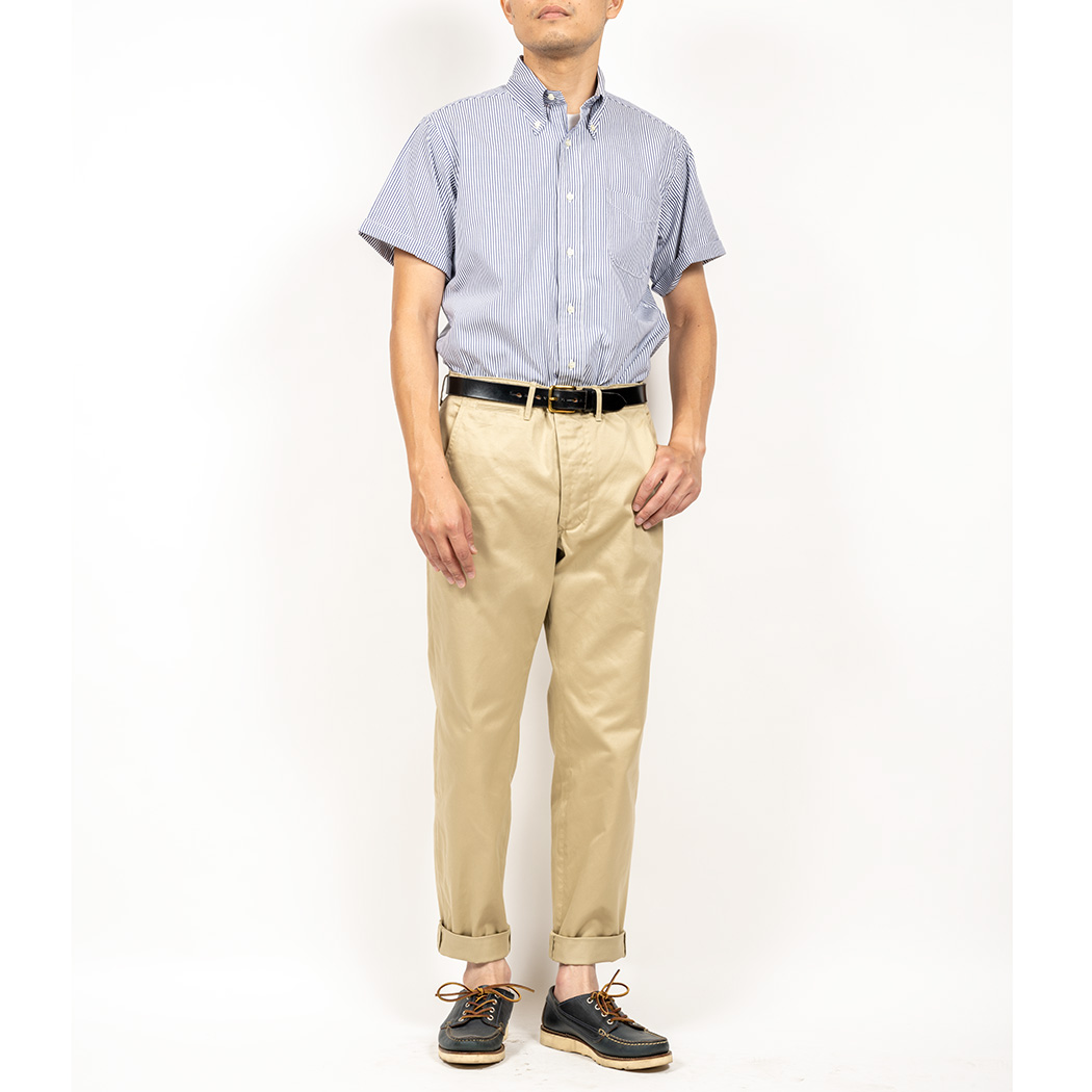 半そでBD にコットンパンツ、ローファーを合わせた組み合わせは私にとって強烈 な「アメリカントラッド」「アイビースタイル」の印象を残しています。 半袖だから当然ラフ、砕けた雰囲気だけど、襟がついて少しドレス風味。そこに、スポーツシャツ的なオックス。 WORKERS定番の5 オンス系より少し薄く、3-4オンスのライトオックスを選びました。