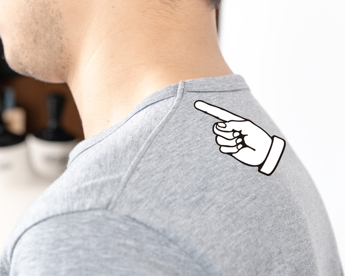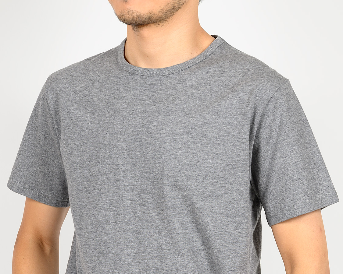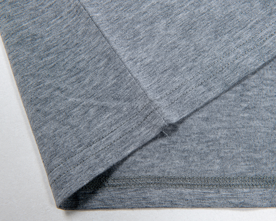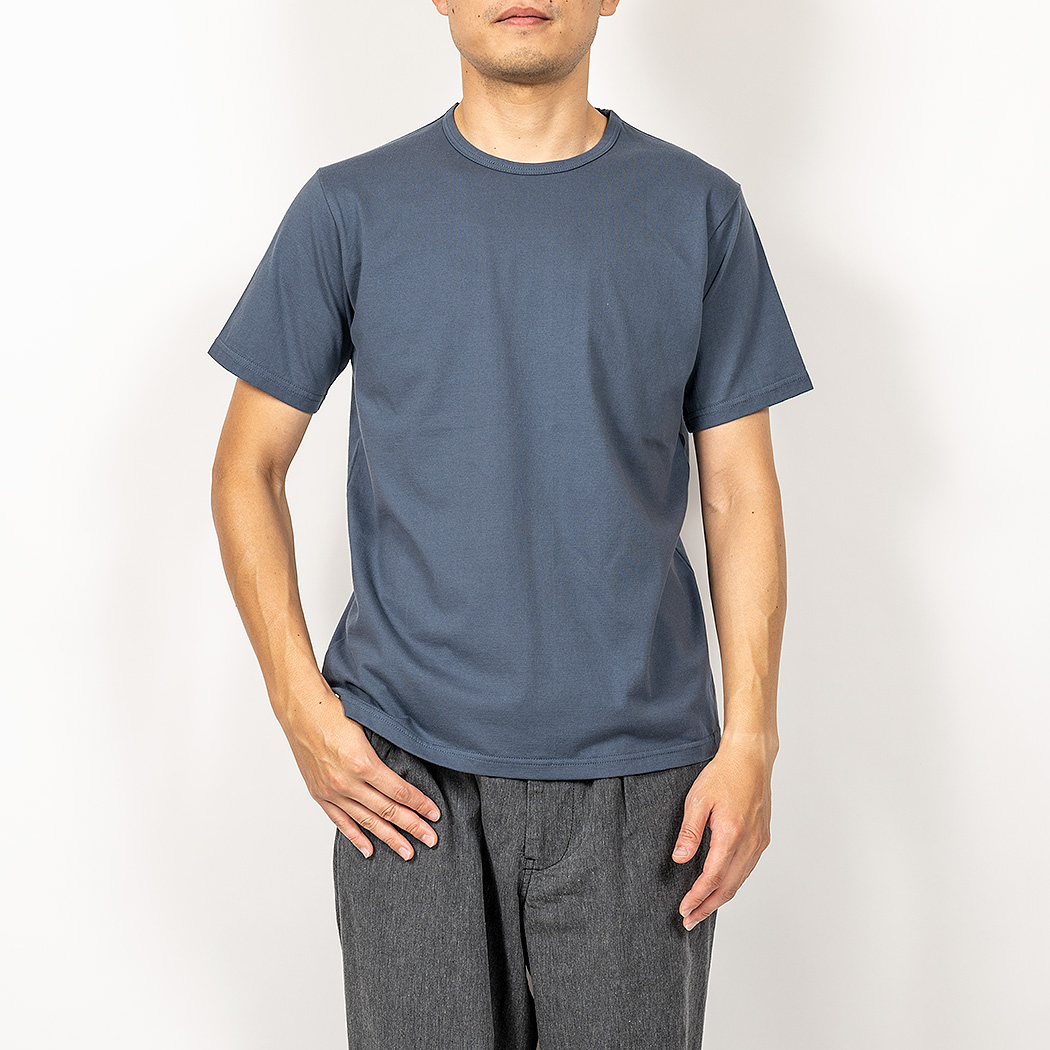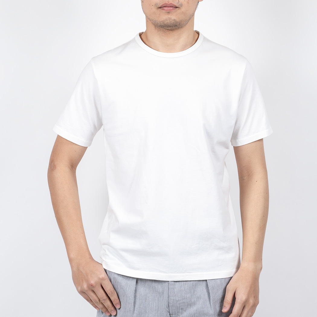 Slim Fit はシャツジャケットの中に綺麗なT シャツを着たいというのが発想の原点。生地に伸びはありますが、戻り(キックバック)が良いので形崩れしづらい。Slimは首回りの縫製を他のFitと変えています。先に前・後ろの首回りを細くバインドして後から肩をつなぐ。つないだ肩は首から肩先まで倒しのステッチを入れる。こうすると、着た時に左右の作りが同じ、左右対称になる。倒しのステッチがあるので、サイドネック(肩線・首の付け根)で縫い目が固くなり立ってしまうのを防ぐことができます。