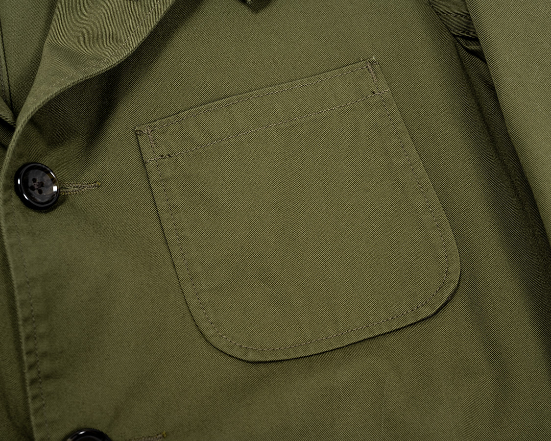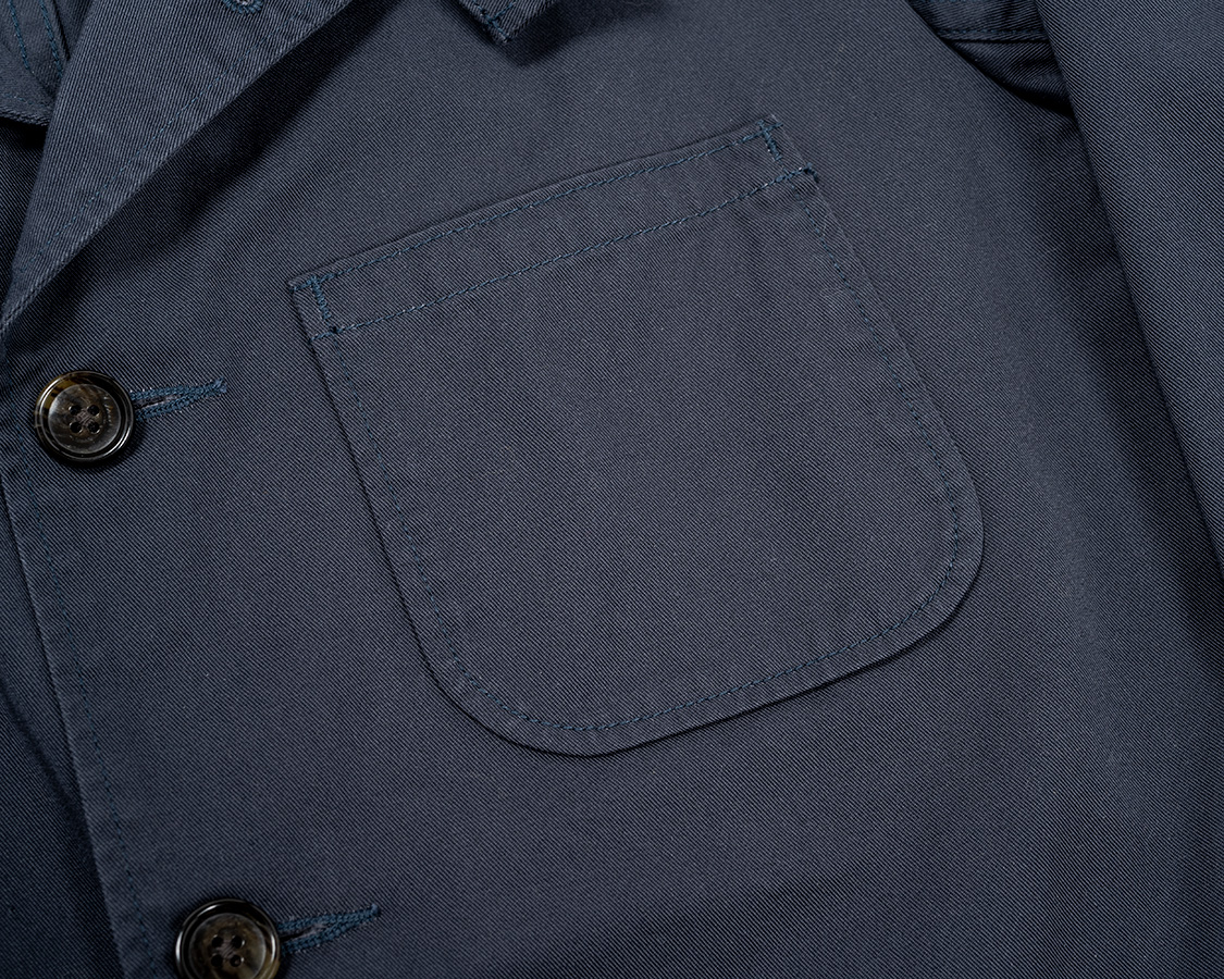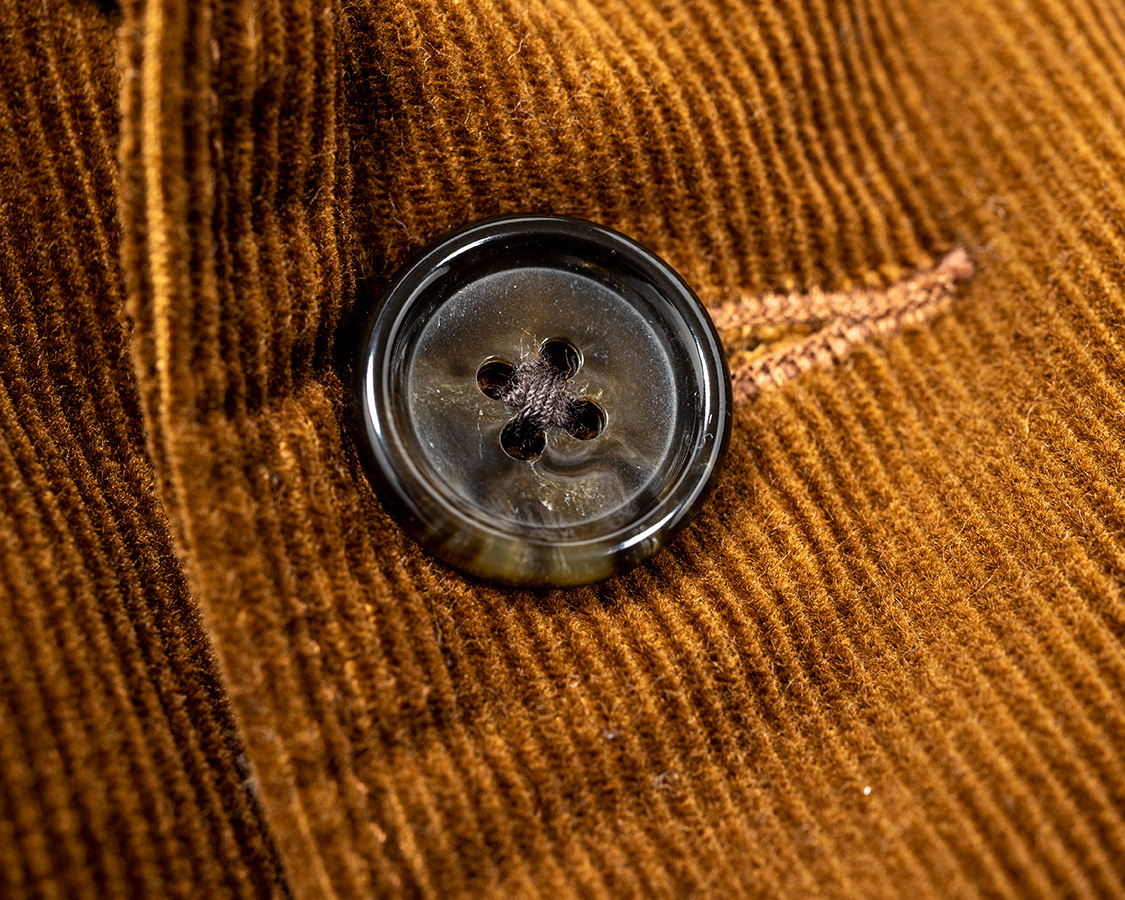 ボタンは樹脂で水牛風のマーブル模様。カバーオール的なラフなジャケットなので扱いのしやすさを考えて。