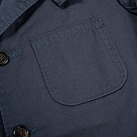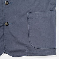 身頃のパターン、ラウンドの無いまっすぐなフロントから裾。フロント一番下のボタンを閉めて着ることもできる。このあたりが典型的なテーラードジャケットとは違う、より「カバーオール然」とした雰囲気。