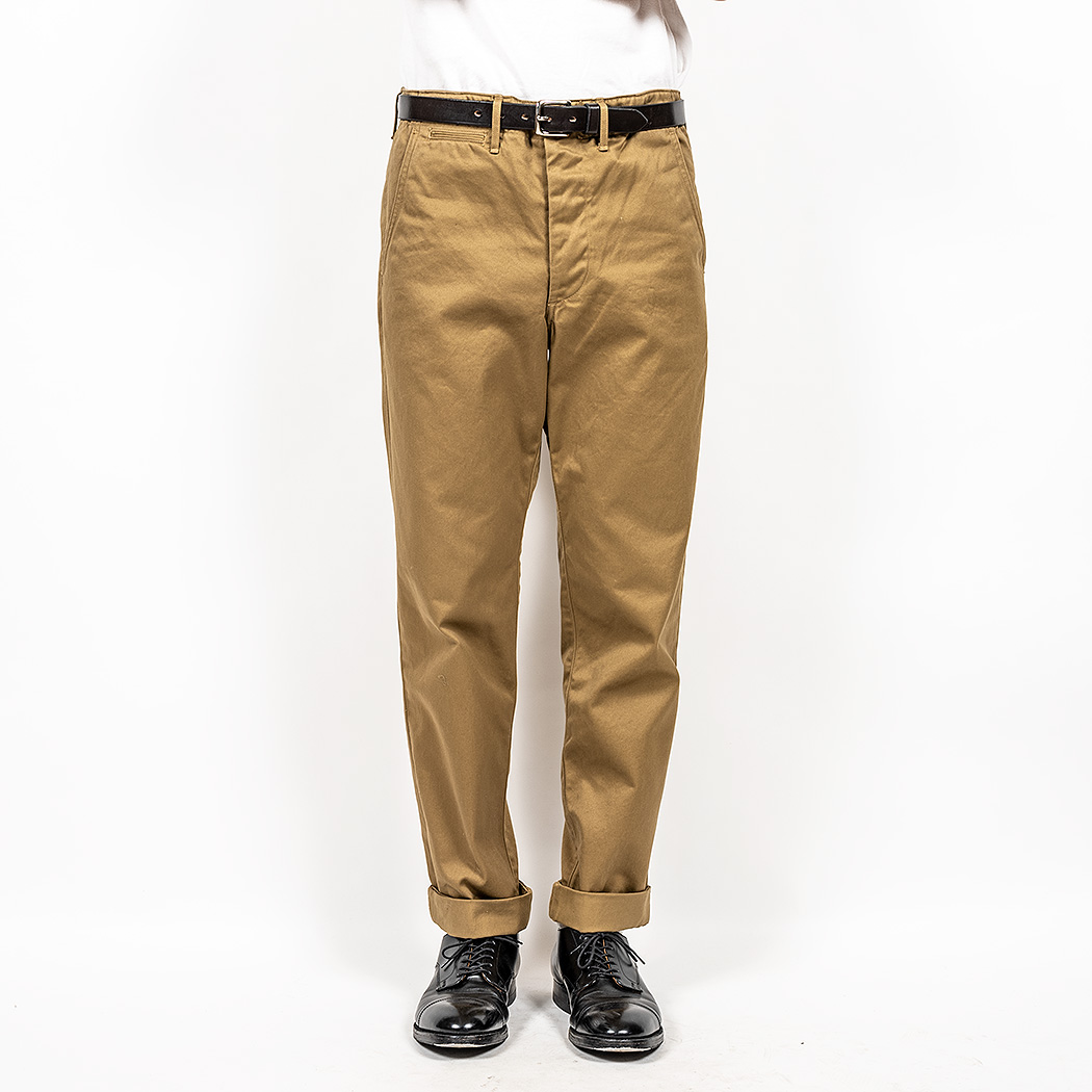 素材は定番のチノ 。USMC KhakiはWORKERS別注で、古着のUSMCと思われる茶系のベージュの個体から色を取ったもの。いわゆる「チノパン」のもう少し白いベージュとは違う。より土臭い雰囲気。