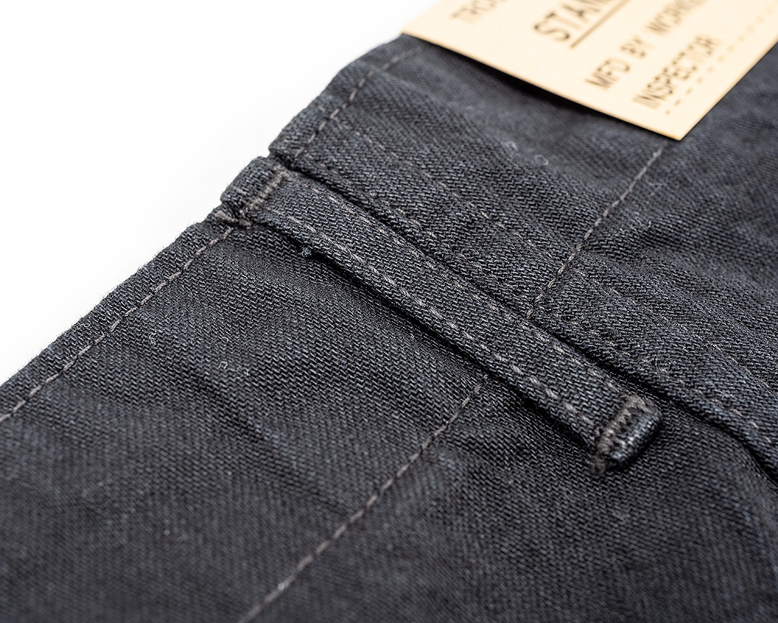 脇に流し込んだサイズ調節タブ。ここ、腰裏つけの時に超難しい部分。腰裏のステッチ2本は一気に縫っていきます。その間にこのタブが来ないと縫い付けてしまう。