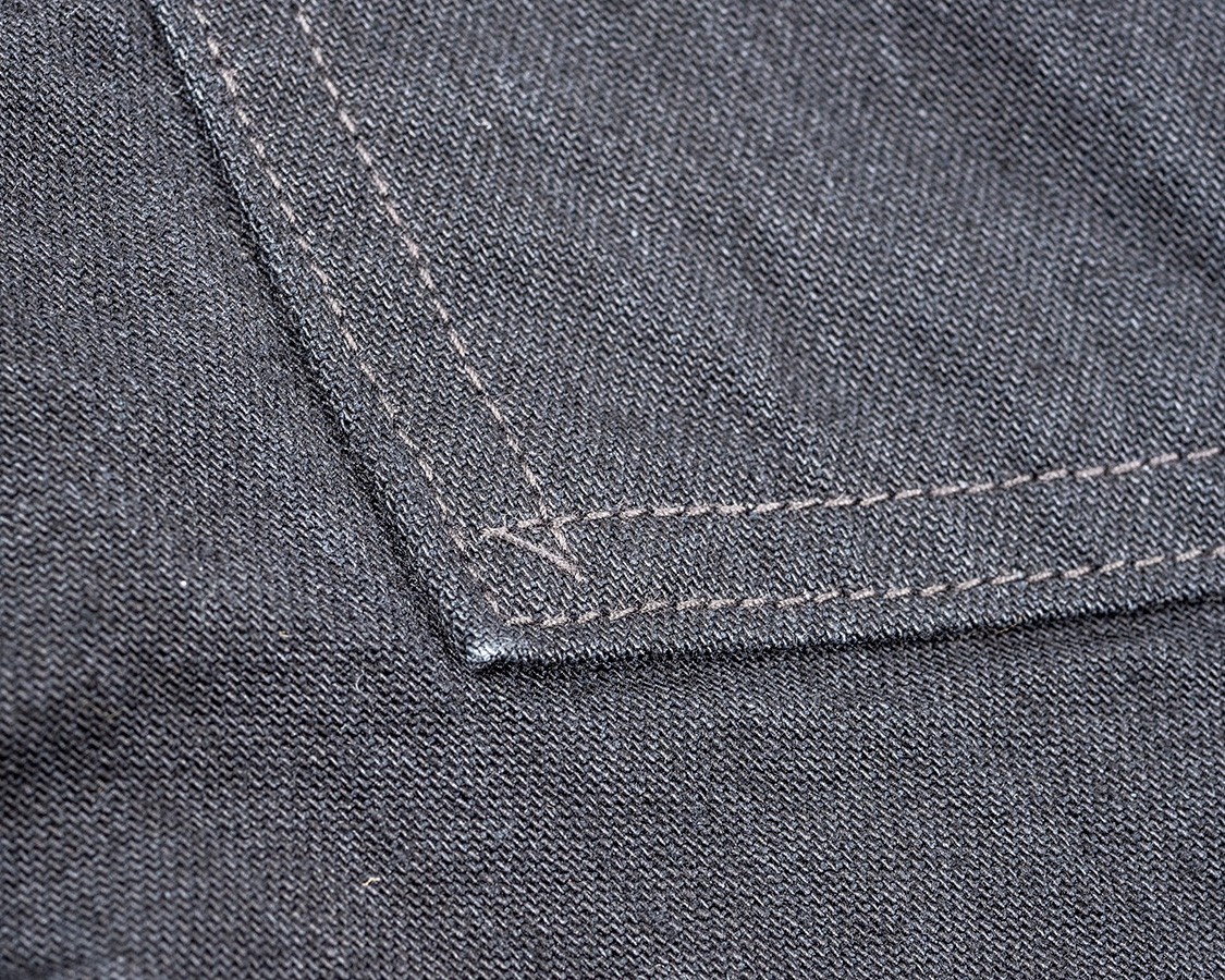 そもそも、脇を巻縫いする前に適切な位置にタブがついていないとダメ。腰裏縫う時はループも流すし、本当に大変。昔のアメリカの人ってこれを何千・何万と平気でやるのだからすごい。器用かつ、量を縫うからこそできるうまさです。