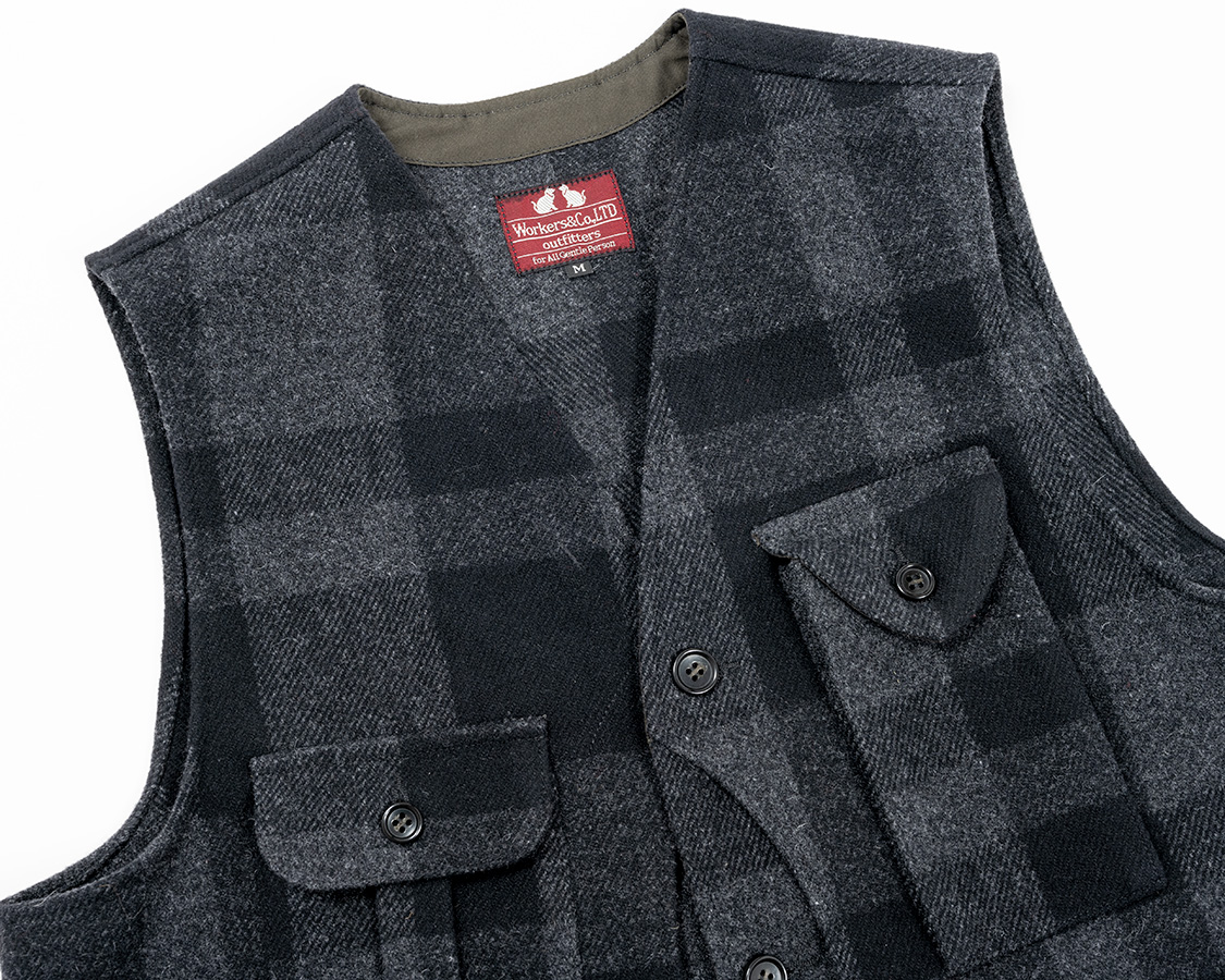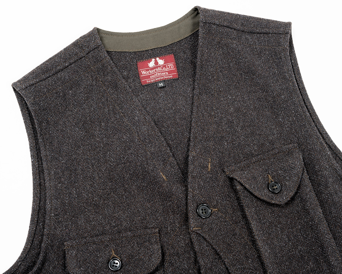 W&G Vest, Vat Dyed Reversed Sateen OD W&G Vest, Surfer Dyed Reversed Sateen Coyote W&G Vest, Dark Brown Herringbone Tweed W&G Vest, Wool Melton, Black x Grey