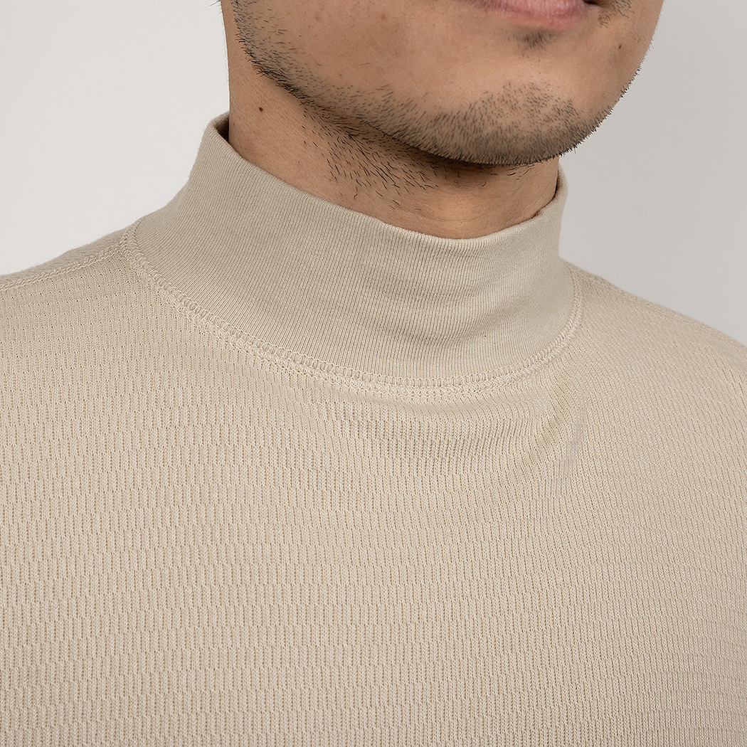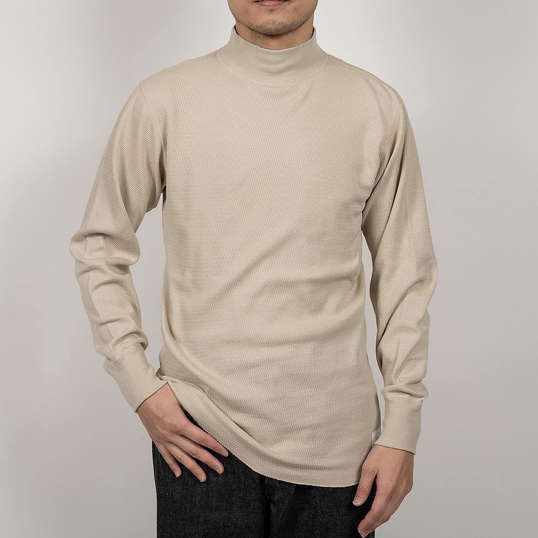秋口には一枚で着て、上に USN Shirt Jacket のような軽い羽織りもの。もっと寒くなれば、モックネックを Outdoor Shirt のインナーに。年取ると、「首」がつく部分は暖かくしていたほうが具合が良い。首は年齢がもろに出るので、そこ をうまく隠しながらちょっと洒落た感じにも見えるモックネックはお勧め。だた、モックネックの難しさは「きつすぎる と苦しくて気持ち悪い」「緩すぎるとだらしなく見える」。ちょっと伸びたモック、若い子がしてるとそれはそれでカッコ イイのですが、おじさんがしてるとう〜ん。そのあたり、型紙・リブの素材で調整しています。