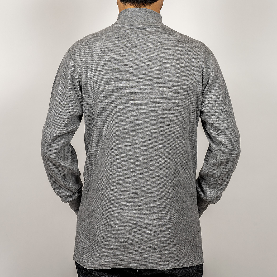 秋口には一枚で着て、上に USN Shirt Jacket のような軽い羽織りもの。もっと寒くなれば、モックネックを Outdoor Shirt のインナーに。年取ると、「首」がつく部分は暖かくしていたほうが具合が良い。首は年齢がもろに出るので、そこ をうまく隠しながらちょっと洒落た感じにも見えるモックネックはお勧め。だた、モックネックの難しさは「きつすぎる と苦しくて気持ち悪い」「緩すぎるとだらしなく見える」。ちょっと伸びたモック、若い子がしてるとそれはそれでカッコ イイのですが、おじさんがしてるとう〜ん。そのあたり、型紙・リブの素材で調整しています。